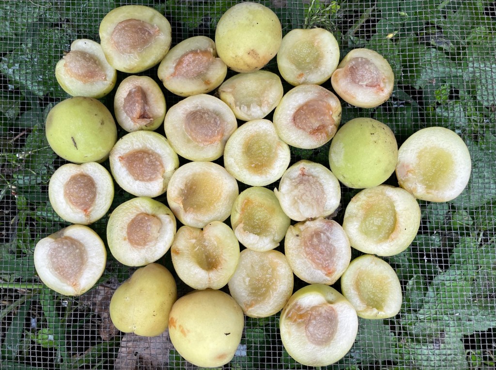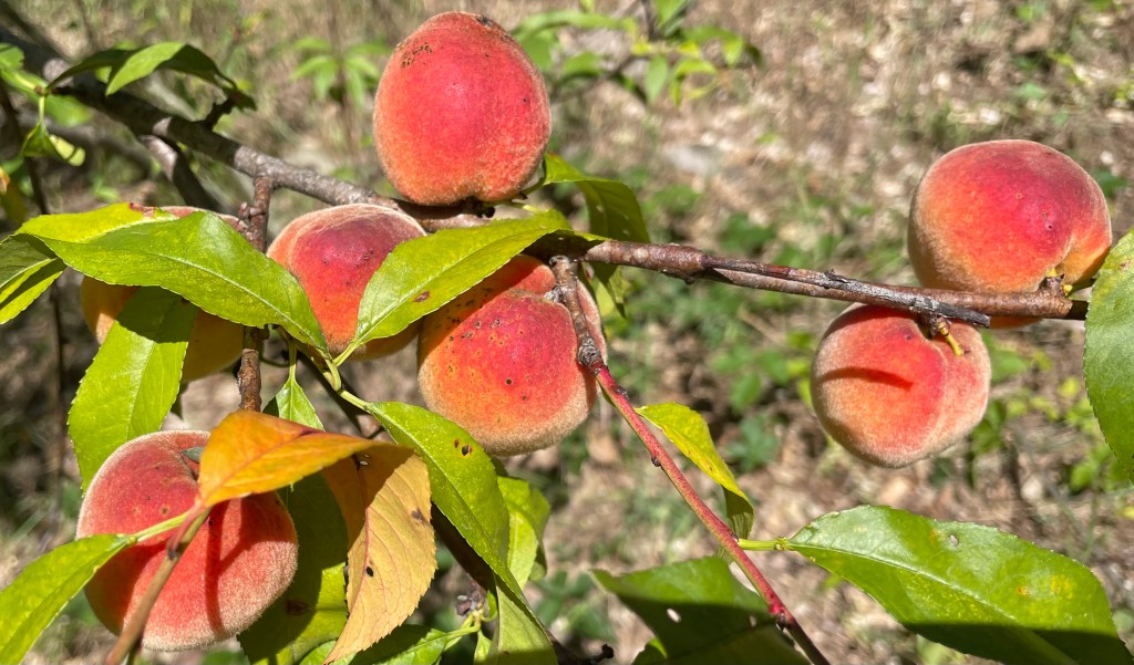 The Mackinaw peach was found as two chance seedling groups from northern Michigan and Wisconsin. It was Steve from Wisconsin who exclaimed in great wonder, “Look what I found!” This image was the first full fruit year on four trees that were the most vigorous and healthy in terms of few fungal issues and insect damage.