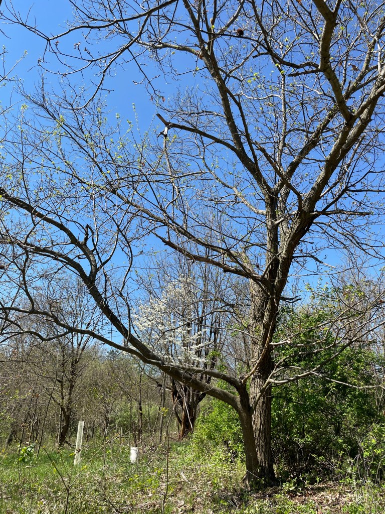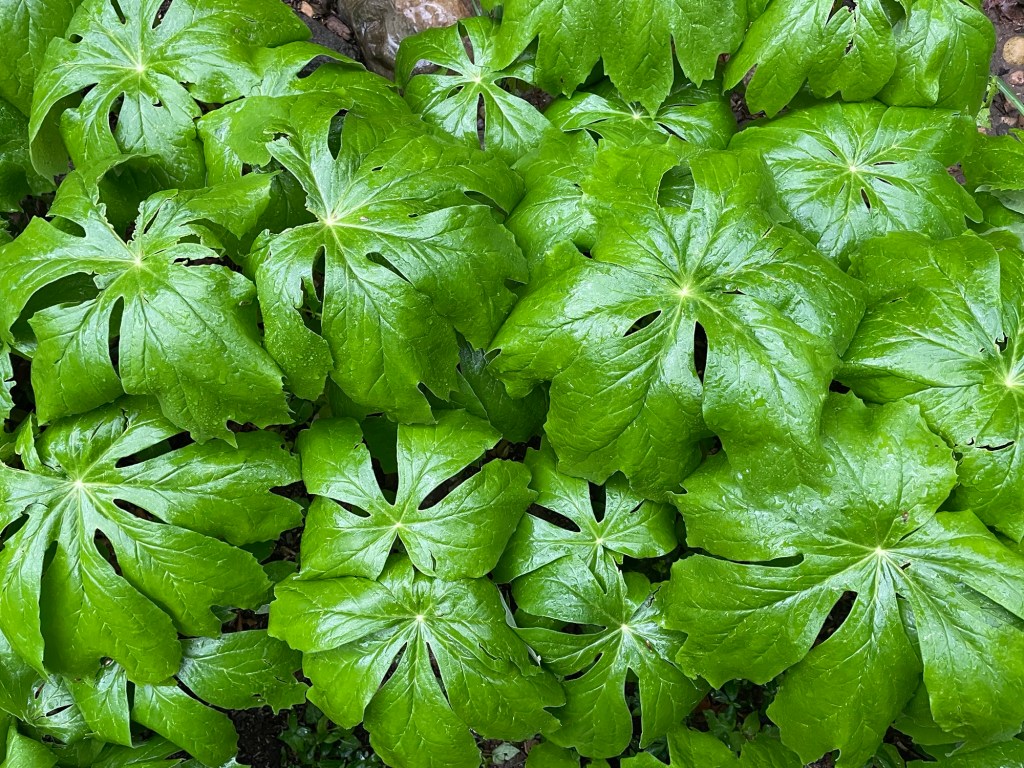 We tend to think of forests as a random set of circumstances creating infinite random configurations of plants each situated spatially that is highly variable. Things are not in rows. We would tend to think, “oh this is much more desirable and destined for perfection” in our minds if forests were laid out like corn fields. If every tree was in a row, we could maximize the production of something spectacular like Maple syrup or hazelnuts. For agriculture rows are very efficient. It turns out that the row system is not the most efficient in natural systems which is why you do not see linear patterns to any degree. Yet like these mayapples I do see a pattern emerging. Do you? Here is something I am currently working on that is a big surprise to me. Random is not that random in my tree crop plantings created by ‘nature’ . What will my tree crop plantings look like in the future? I wondered if I could influence this in some way to create the new forest canopy using the existing germplasm being propagated on site under and in between the trees I planted.