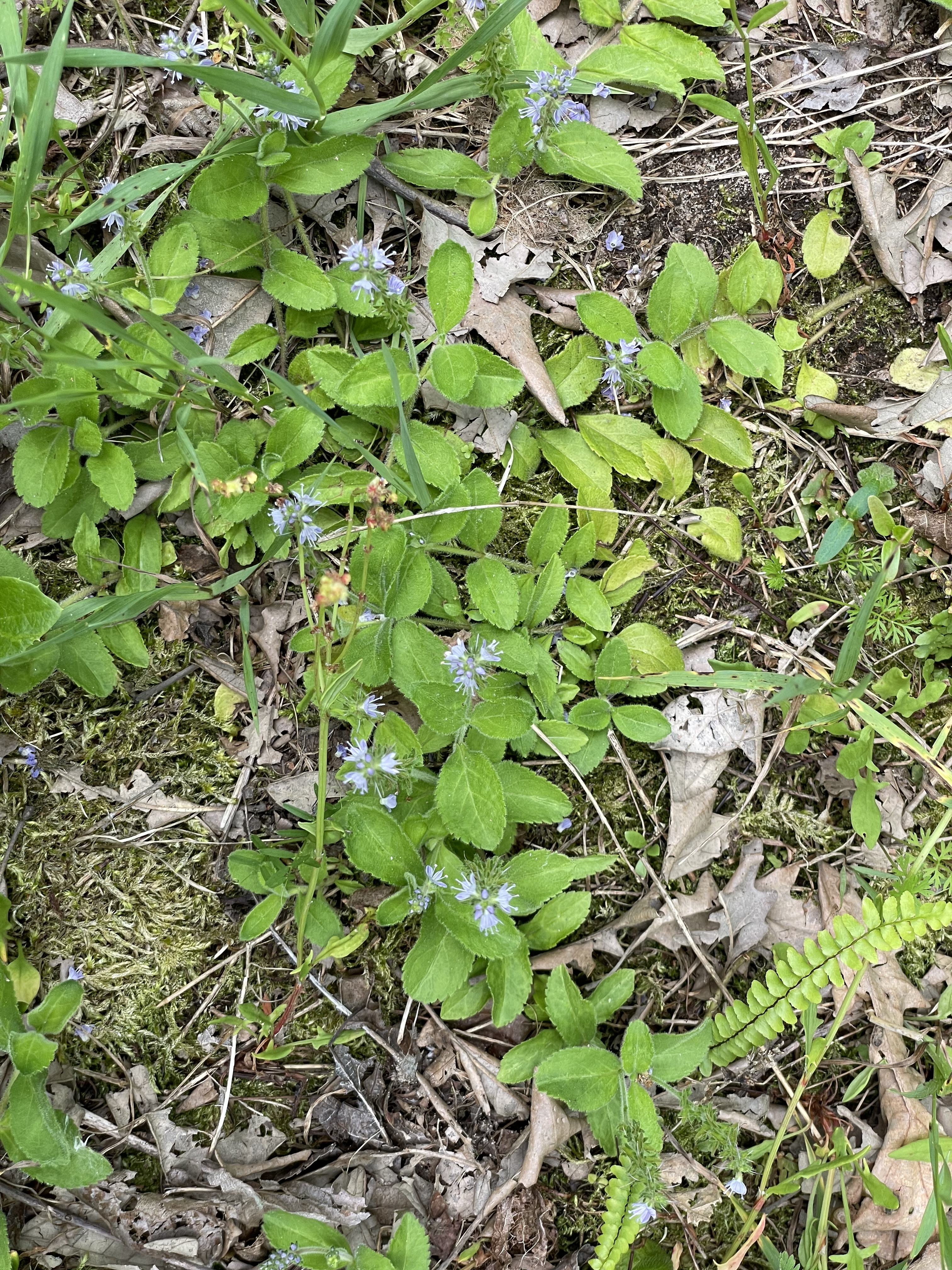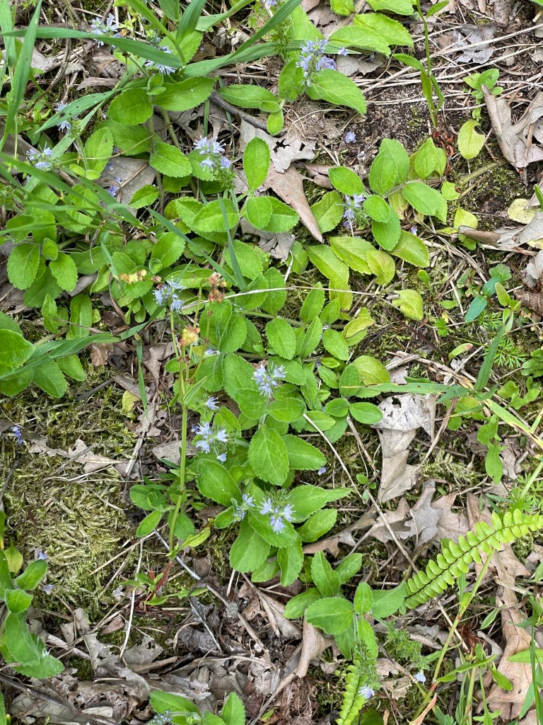 This is the gap created by Speedwell. It tends to grow where everything else is pretty much gone. I am not sure if the plant produces a certain alleopathic effect or if it is just seeding in these areas with oak and apple leaves. This is one of the best groundcovers because it is so easy to harvest on it plus there is no need for mowing or weed whacking prior to harvest. The idea is to have level flat areas so when the nuts fall it is easy to find them and collect. This plant is also evergreen which is an ecological advantage if there is other competing grasses. Speedwell is the gap.