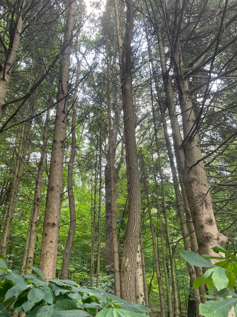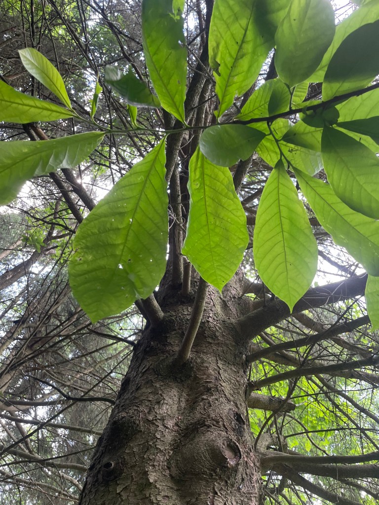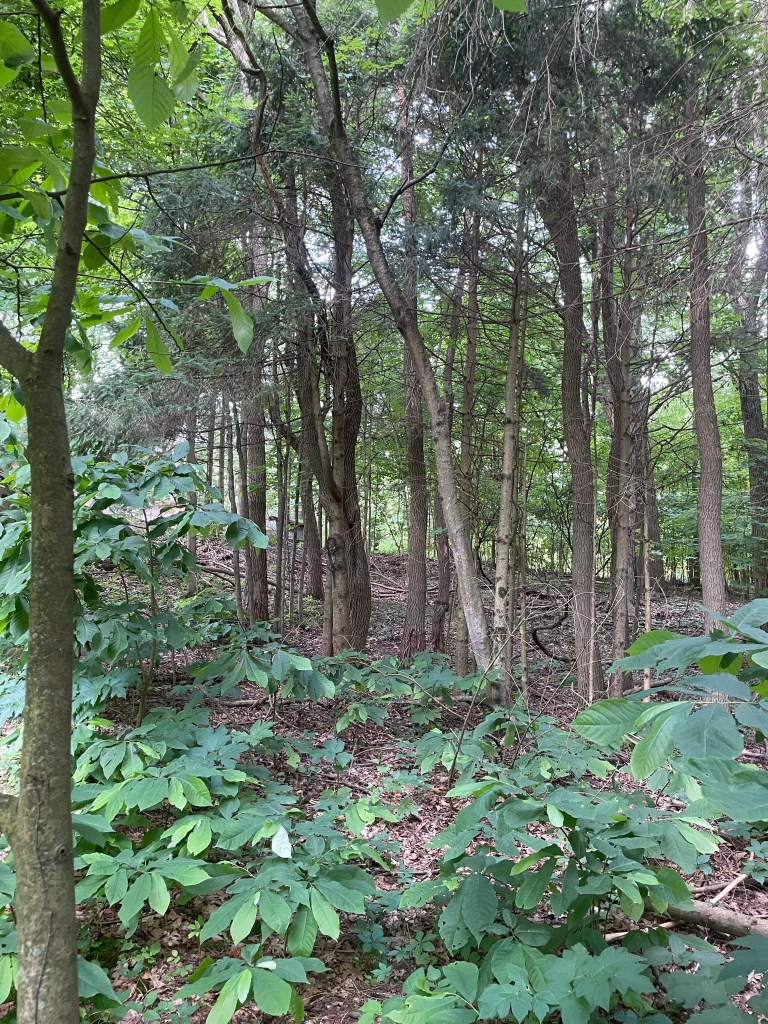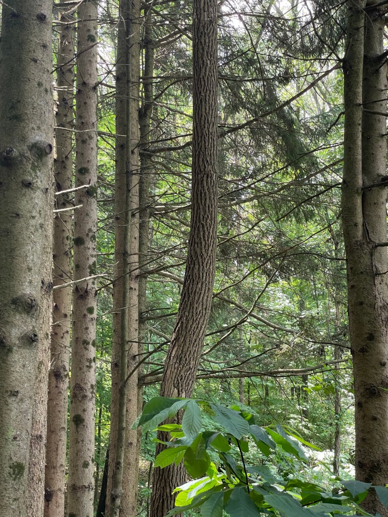 The previous owner of my home densely planted 50 seedling Norway spruce trees near the edge of the woods. Due to the density and the ever encroaching forest it is less than half of what it was due to shade intolerance. For a while, I would prune the lower limbs trying to get as many as possible into the canopy. I planted pawpaw trees on the edge along with mayapple. That was over 25 years ago and now the trees are really moving out into the forest as a colony. The Norway spruce thrives on the edge in the light providing cones for the red squirrels, cover for the deer and protection for the mourning doves. It has woven itself into the tapestry of the forest along with the sassafras who found a few openings in the canopy created by the decaying and dead spruce. A few ferns have seeded in and I added a couple too. It’s a makeover of what was once my garden enriched with horse manure. Today my garden still exists here as a mosaic of potatoes, sunchokes, lilies, yucca, sedge, buffalo grass, Miscanthus, Wild oats, cup plant, mockorange and honeysuckle encased in a bit of green bishops weed each filling in an area that was once highly tilled and amended. It is too shady now for a real garden. No peppers or tomatoes are possible.