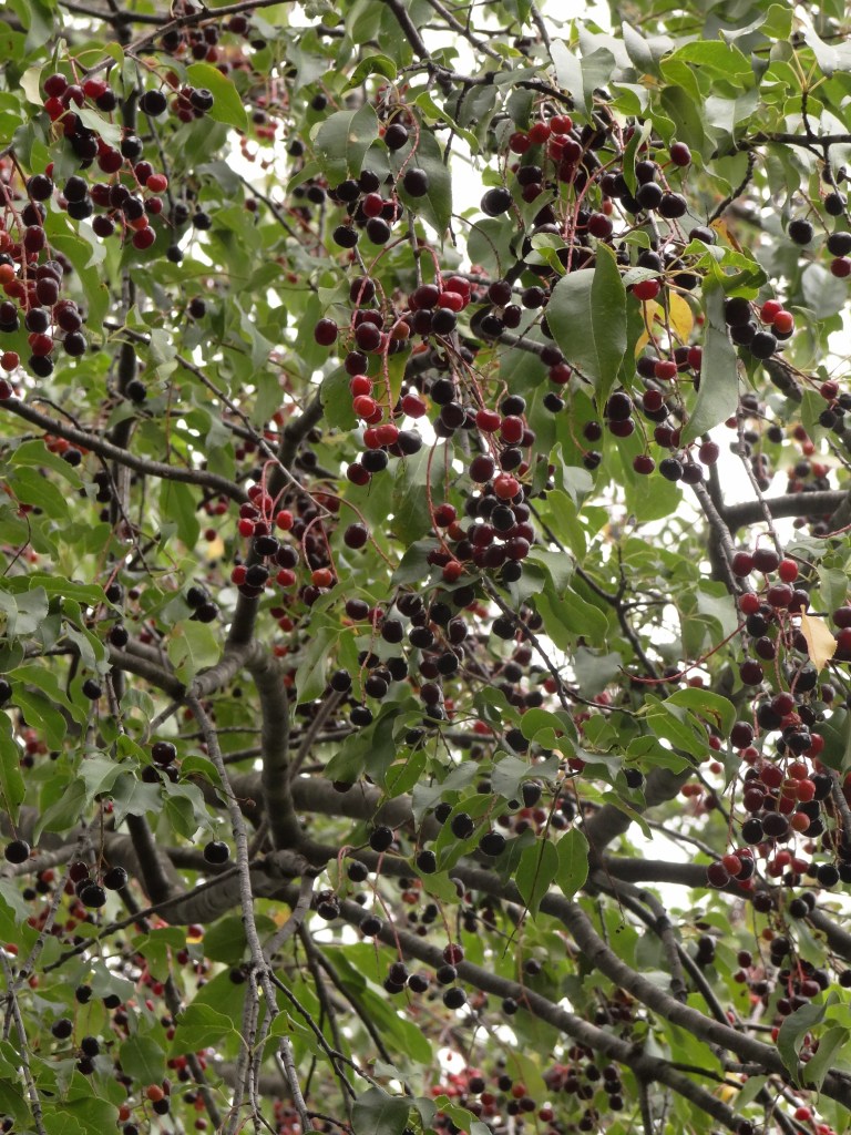 Many times the existing landscape contains some great jewels that you might not be aware of. Such is the case of the wild black cherries, Prunus serotina. It is the paint that drops from the sky as birds often carry the pits in their beaks as they strip off the fruit. It is one of the most common understory plants at my farm. Early in 1980 in my pasture were four nicely established black cherry trees. I limbed them upwards as they grew. They were in the middle of the field on the hills isolated from one another. As time went on I could no longer climb or prune them. I put owl and kestrel boxes in them for some time too. After talking with another tree friend down the road, he commented that many of the black cherries in the area had fantastic strong upright growth with excellent branching. He too was using pole pruners and eliminating the often found narrow crotch angles so common with this species. He had found some of them had strong apical dominance and were easy to guide upwards. He kept those and removed other trees competing with his new idea of cherry woodlot. None of the trees he planted. Some were growing in an abandoned vineyard. This inspired me. As a result, I began to take notice of one tree in particular and found the fruit to be delicious and possible to eat fresh off the tree without wincing. It had none of the astringency in the fruit so common with wild black cherry. Eventually I made a delicious jam from it. It was like a black cherry concentrate. Because of my voracious pruning, it became difficult to pick the fruit so now I have a way to shake certain branches to drop the fruit when it is ripe. As time went on, I kept other black cherries that showed this strong growth habit. One is a new selection which I haven’t named yet or made available. It was found as a seedling near a planting of pears I had. It was so fast growing that it was almost like it appeared out of nowhere to me. I could not cut that down. The pears can tolerate its shade easily. I have found other individuals I have kept. Once I grew the South American subspecies “Capuli” . Winter froze them to the ground every year. They have large fruit and are harvested for preserves.