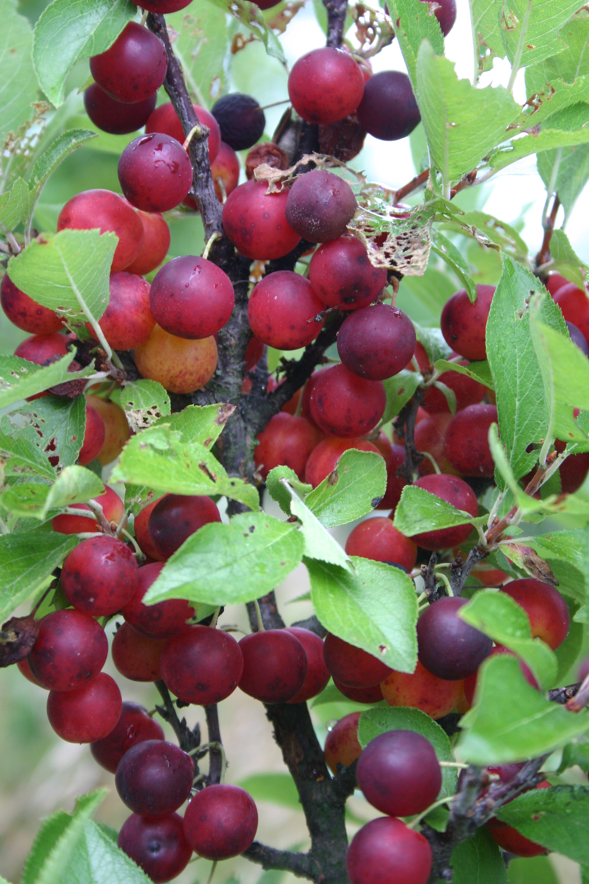 There has never been a greater example of a species of fruit that could be grown as a species of fruit without employing the cultivar based system of fruit growing. The above image is one of the first beach plum seedlings grown in my open field using prolific fruiters selected from populations I was growing for the mail order-internet nursery trade. I noticed it was quite common in beach plums to see flowering on young one and two year old plants. I would tag these plants and carry them to one of my hillsides and plant them in small groups. This was a success. The pasture was thick with grass still and I would use a cellulose mulch mat and the black polyethelyne types. The plants grew very nicely in these locations. I would add a layer of sawdust as mulch after the plants got established as I removed the mats. As time went on and I grew successive generations from these plants from seed, they too were very productive and had a more compact nature to them which came through in the progeny. Now called ‘Nana” it was my first seed source of the beach plum, Prunus maritima. I sent seeds around the world to share in my discovery at the time.