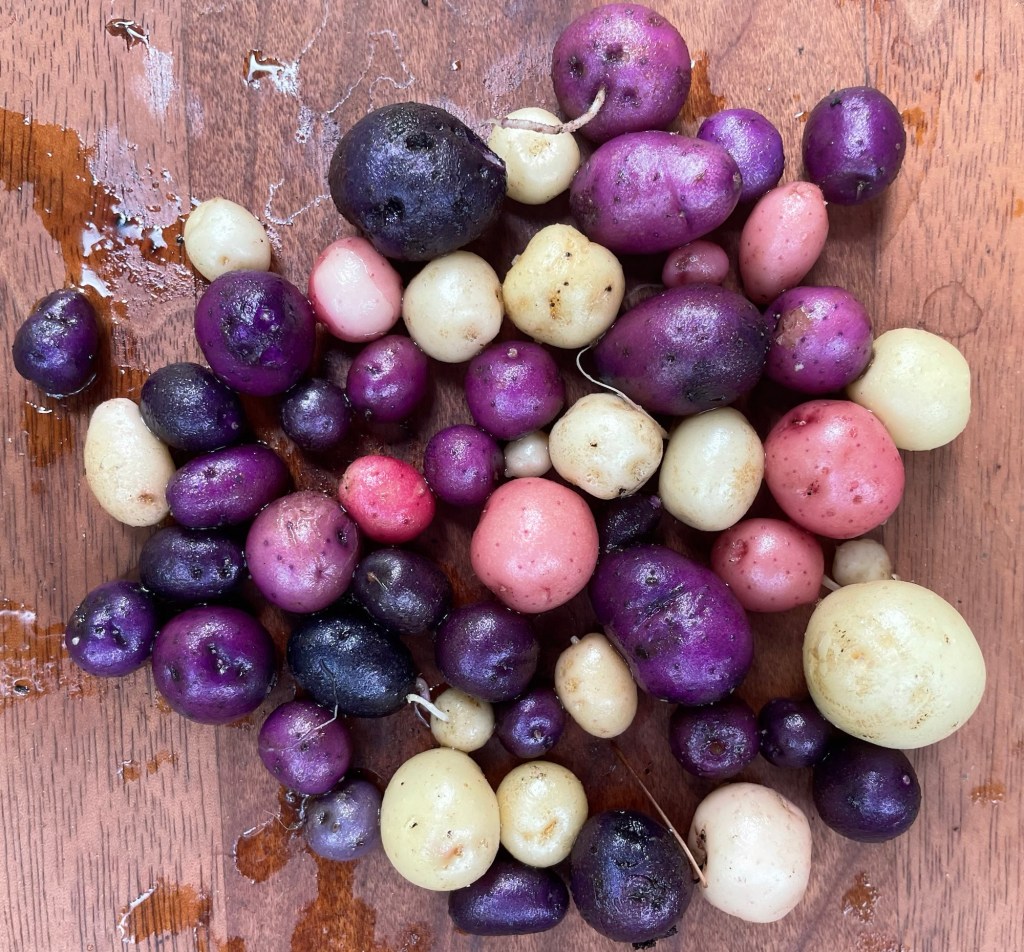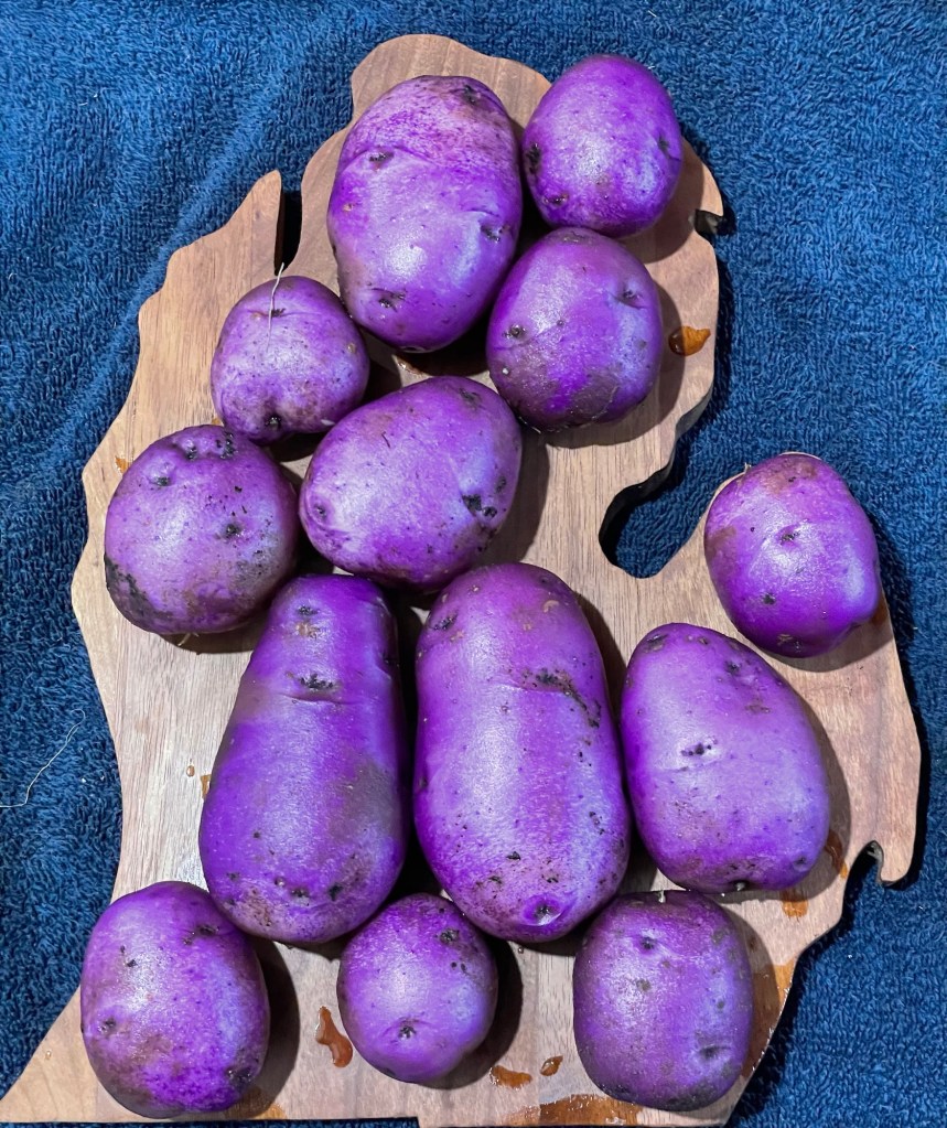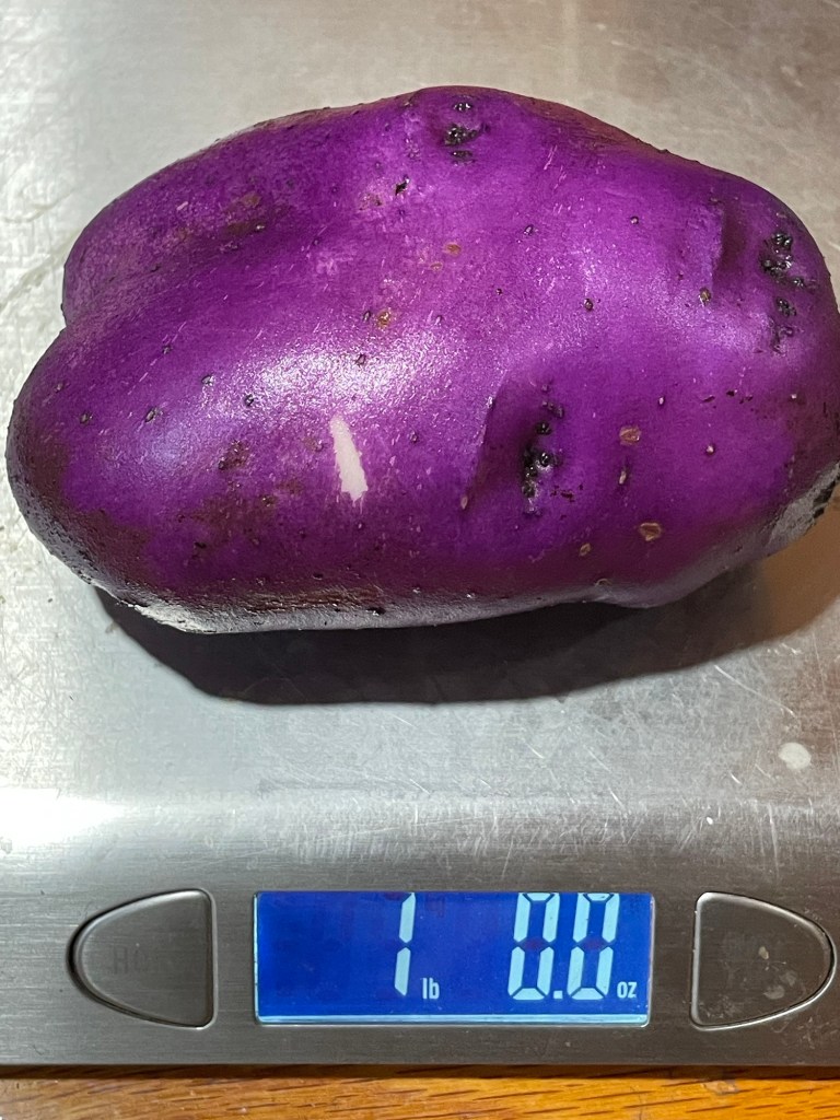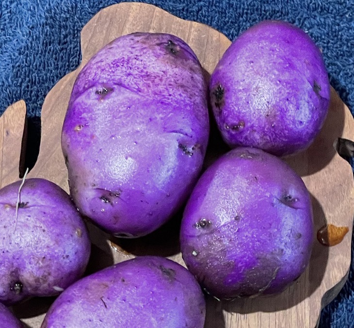 ‘Tranquility’ makes the case for a short season high yielding potato. Planted in early May, the crop is ready to harvest by August 1st. I would put it in the 70 day range for ripening fully from emergence of the foliage to finish. The foliage has been free of early blight with no signs of heat stress. The top begins to go dormant in late July and decays quickly making harvesting very easy. The foliage remains clean throughout its growth cycle and appears totally insect resistant. The main stalk is square in shape with a pyramidal struture to it from soil level to the top of the plant. The tubers are clustered tightly around the roots near the main stem. I hope to measure yields more precisely this year. Sizes run up to one pound each. The bright purple and violet color is distinct and desirable from a retail sales level. The potato has a pure white interior with a very smooth and creamy texture. “Tranquility’ was grown from seed of a blue heirloom potato of which may have crossed with ‘Zolushka’. It was found in a seed bed that overwintered several years before I started noticing the yields which greatly exceeded all other seedlings I had grown up to that point. It is uncertain if it is entirely winter hardy. It does have very good cold tolerance. Although grown from a diploid, it does not produce berries. I am not sure of the storage qualities but at my farm it could stay at room temperature for three months prior to sprouting without refrigeration. At this time, I cannot detect solanine but will have a test done with this along with yield data.