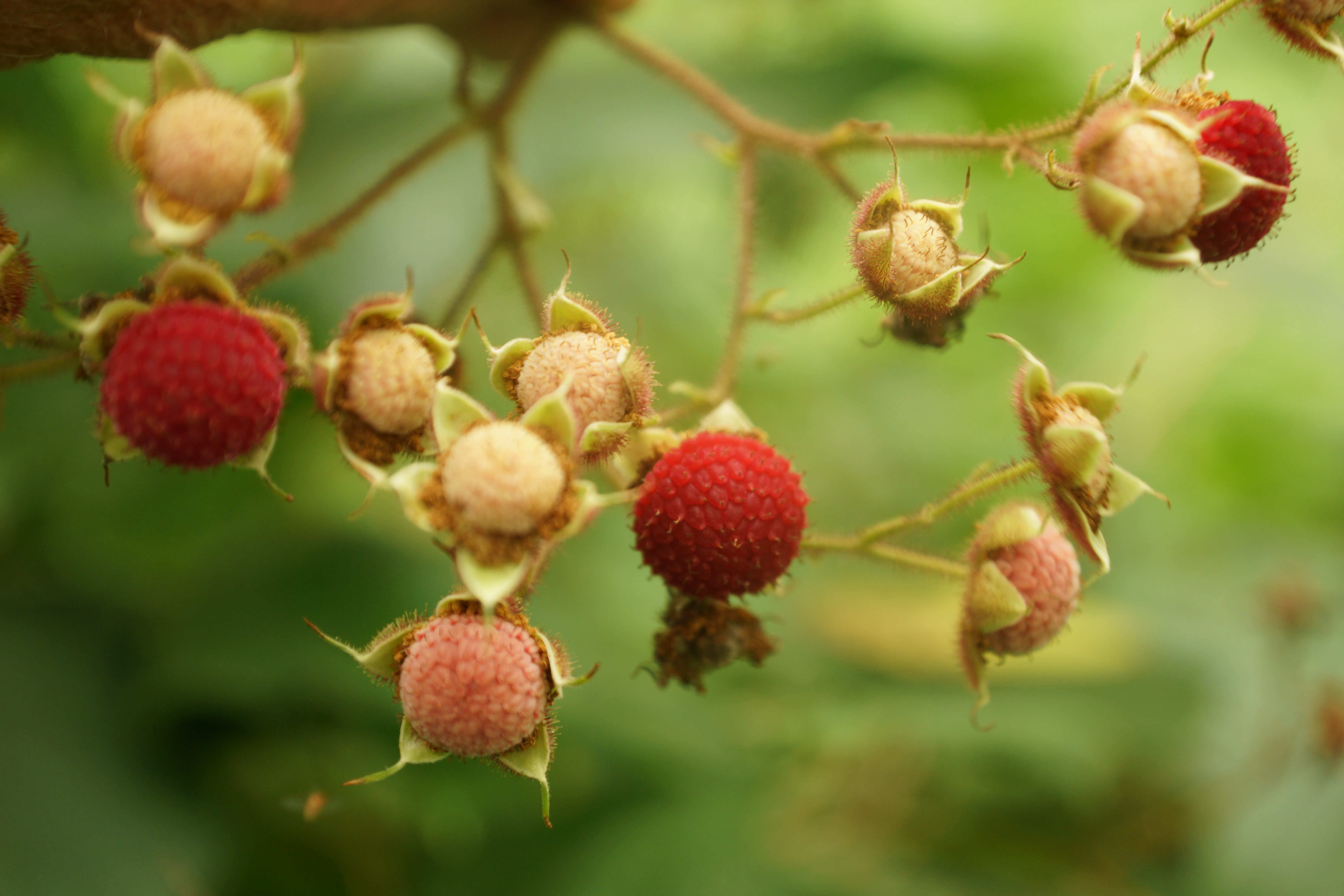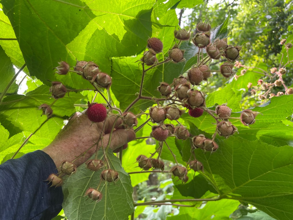 Japanese wineberry is the sweetest of the wild raspberries. It is very easy to collect and harvest large volumes of fruits because they sit on the top of the canes. It spreads by both tip layering and runners. Its use for for jelly, jam, syrup and wne. It is easy to process and the fruit is always clean. In Michigan, the species is not reliably winter hardy. I lost the tops of the plants if it hit in the minus 15 to 20 range. There are several forms of it and I found a group from a collector who thought it was higher yielding and slightly hardier. It has not self seeded at my farm. Its a thorny one and delicate movements like a ballet are needed as you weave through the canes. This species is collected here in the United States too for wine and jelly. Once while traveling from Washington, D.C. I saw many people harvesting at a rest stop along the highway. That is the perfect place for wineberry.