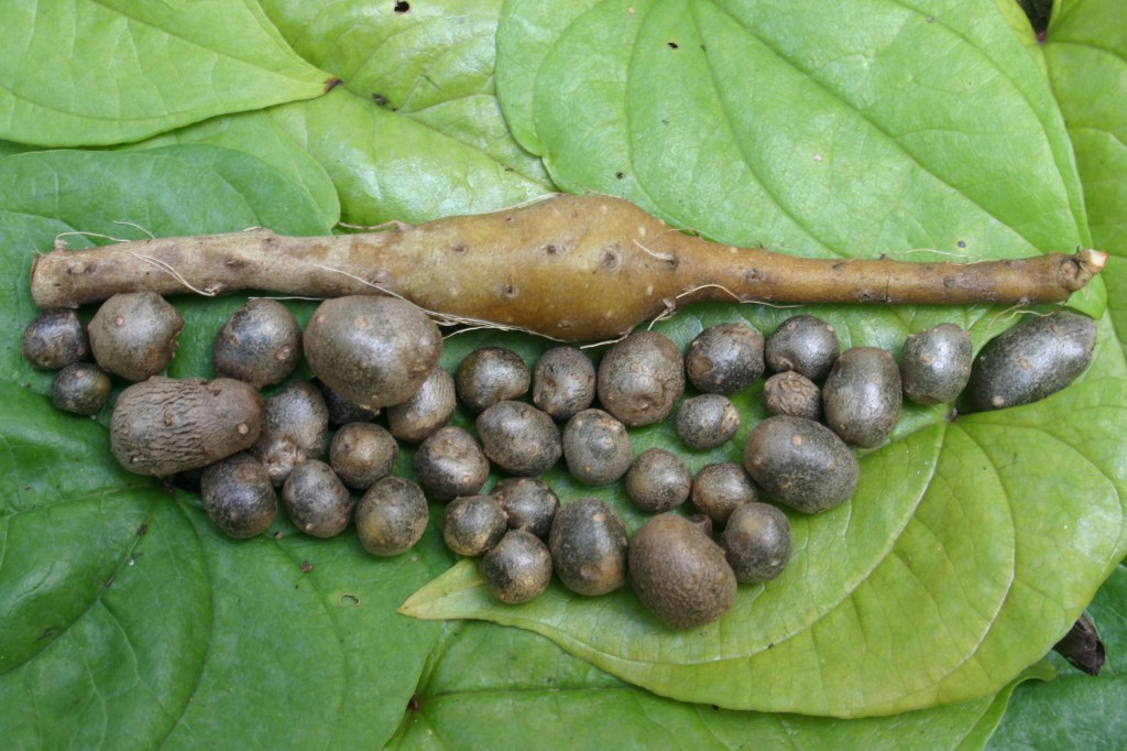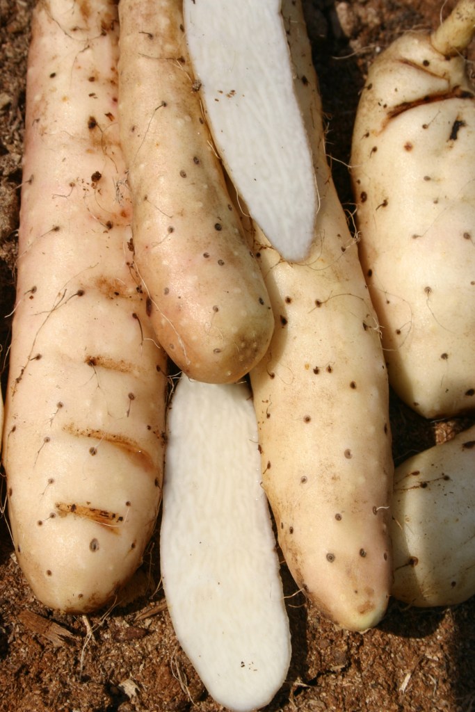 Chinese Mountain Yams- This particular vine requires a very large trellis plus it still has to be accessible for the harvest of the small round aerial tubers. They form on the axils of the vine. This is the easiest part of the plant to harvest and use. It is such a wonderful perennial vegetation yet the harvest of the main tubers even if done by hand with long drain spades is very difficult. Using the word harvest is a friendly term. I would prefer to say extraction like mining. It was slow and hard to retrieve full roots. For that reason you will see many unique growing containers and systems to capture the most from this species without having to dig three foot deep holes to retrieve a tuber. One of the most simple is evestrough like devices buried with the tuber planted just above it. This way the tuber takes a left or right turn rather than going straight to the center of the earth. Another is to use grow bags in or out of the ground. Very easy to contain. Despite its vigor, it is a plant that grows well but does not spread easily because it’s sterile (the plants sold are all female plants) and the bulbils freeze and turn to mush in the winter if left on the ground. But it does regrow new tubers under existing tubers so for that reason when I grew and sold them I used to till next to the vines to prevent competition and make it easier to harvest the larger tubers.
