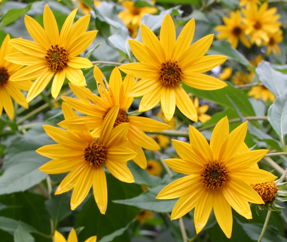 Is it bland, oily, rich or cardboard? It is surprising in that each sunflower selection is different. The species types can taste like a pine cone. My goal is to taste as many sunflowers as possible. I am finding the short season plants under 60 days. It is different type of selection because you want small seeds and heads to fill all along the stem. You want the strong over the top flavors minus the barbeque and ranch. But more importantly when people taste even the raw seeds they experience the ‘wow’ factor like I did when I first started looking into this. I visited the Chicago Botanical Garden’s sunflower collection once. It was my Jimi Hendrix moment where you want to throw out your guitar. It reminded me why I thought I had nothing to contribute because it all ready existed. The sunflower is very unique in its ability to redefine itself. It can change and realign your thinking about it and how to best harness the sunflower power. It creates a new means of expression very easily. Like a dahlia, changes are always going to happen in unexpected directions. You just have to be there and notice. It’s a good example for woody plants. There are the tiny heads of sunflowers filled wth great abundance along the stalks of the polyheaded sunflower.