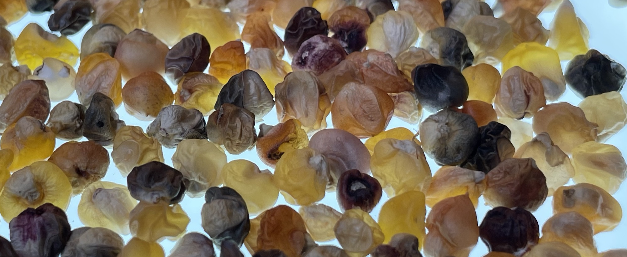 Small kernels are rich in anthocyanins and nutrients which are produced as a grass plant capable of producing a grain. The cob becomes a sheath opening up the kernels to sunlight for the first time in 9000 years.