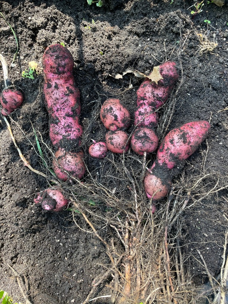 Potatoes grown from true seed create a whole myriad of exciting traits some of which are confusing at first but revealing about the wild spud of yesteryear growing out of rocks in the Andes mountains. This particular clustering of tubers creates a very small one foot tall plant which produces between 50-70 potatoes. Its hard to count them all. The seedling was grown from my Perennial Perpetual Diversity seed mix and was one of those dense fibrous compact roots found in a seedling population. The above image is in the second year of growing it. Next year I will devote more time to this and split up the clusters a little. This was definitely an outlier in the population but seriously what’s not to love about this plant. To me its the perfect potato filled with wonder and excitement. The below image is another form that was found in the same population. Here the potato decided to produce the spuds in a more robust and larger fashion. It too is in its second year from tubers. You cannot predict what will happen and each one is different.