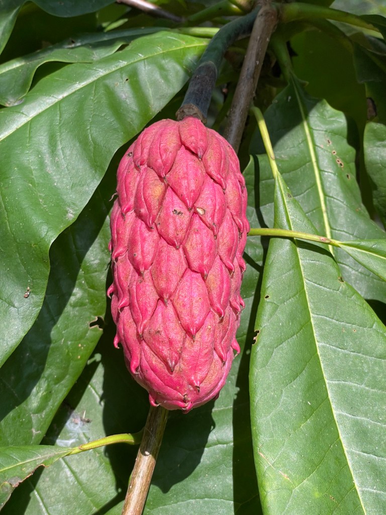 All joyous discoveries come from unexpected directions. Such is the case for the Umbrella magnolia below. Today they reside in my yard planted over 25 years ago. Originally a lone tree was found on a berm at a fast food restuarant. I got a call late at night from a horticultural friend of mine from college who asked if I had seen the fruiting Umbrella magnolia tree at the Long John Silvers restuarant. How in heck did that get planted there was his comment. I had driven by it for a few years thinking the same. How in heck? Here on a berm smack dab in front of the restuarant known for its delicious fried fish was a rather unusual horticultural find. The next day I found a grocery bag at my house filled with the beautiful red seed cones. He went in and asked the manager if he could pick the fruit. They thought it was odd but fine to do that. At that time, I was growing many seedling magnolias in my nursery but not this one. The issue usually is that seed companies ruin them by over drying. When I moved, I quit selling them and put the remainder around my home. I collected the seeds this year because there was quite a few. I thought back to my friend, fried fish and the eventual demise of the tree. I got an email from him letting me know the tree had been uprooted for a new landscape replaced by the sterile mini-compacta shrubs. He told me not to look as to avoid the pain. Too late, I saw it. It sat there on its side for some time before they chipped it up. Luckily I captured the germplasm. Its progeny will live on. I have the Long John Silvers near the parking lot entrance magnolia now. I had converted them to the black oak and hickory woodland. It was easy to do and there was only joy remaining.