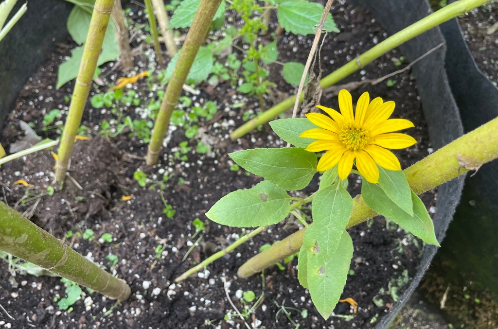 I grew a lot of sunflowers over the years. I loved all the varieties but they were too uniform to use for finding new characteristics. It was from this accidental seedling that I found near a cottage that had more variation and a means to find new traits of unknown possibilities. Here is the smallest plant I have found so far surrounded by its siblings. Under a foot tall with a tiny head is ideal to cross with the sunchokes. I bend down the Jerusalem artichoke flowers near this sunflower to make it easier for a bumblebee to go from flower to flower. The timing is critical and it might be too late but it is fine in that I can try a more robust planting of teeny sunflowers next year. I will save the seeds of the annual and perennial plants in the process and see what discoveries lie ahead. I blasted the area with fish emulsion and deer-off yesterday. This combination of stench and fertilizer seems to be a bumblebee magnet and brings them in to the point the whole planting is alive with the sound of music. zzzzzzz……go to the sunflowers my humble bees. I love the music you make.