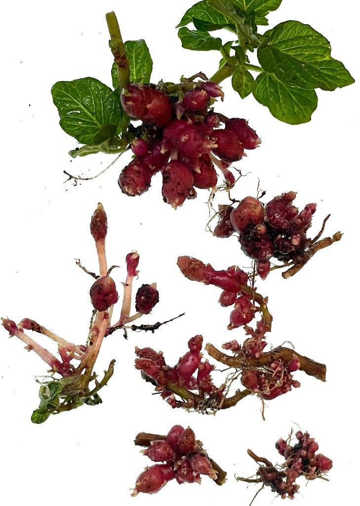 Looking at the roots of potatoes is enlightening. You start with a microscopic group of tiny cells along a rhizome which then explodes outwards into the spud we enjoy today. I always have the thought it is likely the same laws of nature that create galaxies but on a microcosmic level. Here is a slight variation of this trait like a clustering galaxy creating more galaxies of tubers found all from one small plant. It is a very unique and highly structured orderly potato.