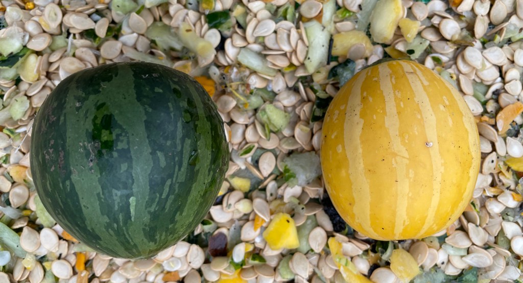 I gave up trying. This spring I drove over some squash and gourds which were produced back in 2022 and sat on the ground near on my packed gravel driveway for almost two years. The vines started on top of my wood chip compost pile-driveway and grew up and over the pokeweed and onto the driveway taking up quite a few parking spaces. I let them go. No one was parking anymore. The gourds sat there as they dried over the winters. It was funny in that prior to my crushing gourd experience, nothing was happening. There were no new seedlings from the 2022 crop. The gourds just sat there in their entirety. No animals drilled into them. No one was tempted to snack on them. No bird pecks. It looked two incisor marks were on one fruit. It looked squirrel to me. Nothing for two years. After crushing them with my Dodge pick up truck, the dust and seeds spread out on the ground in great abundance followed by massive amounts of seedlings many of which grew right into the gravel. I began to think what would help in this conversion for the species. I am sure the squash plants were asking ‘Where are the cars when you need them?” Obviously the snow, the freezing temperatures, the massive spring rains and lots of animals wandering by did not touch the gourds or seeds. There the seeds sat protected and locked into their shell type universe while riding out their quiet life until I drove over them. Why could I not replicate this before?