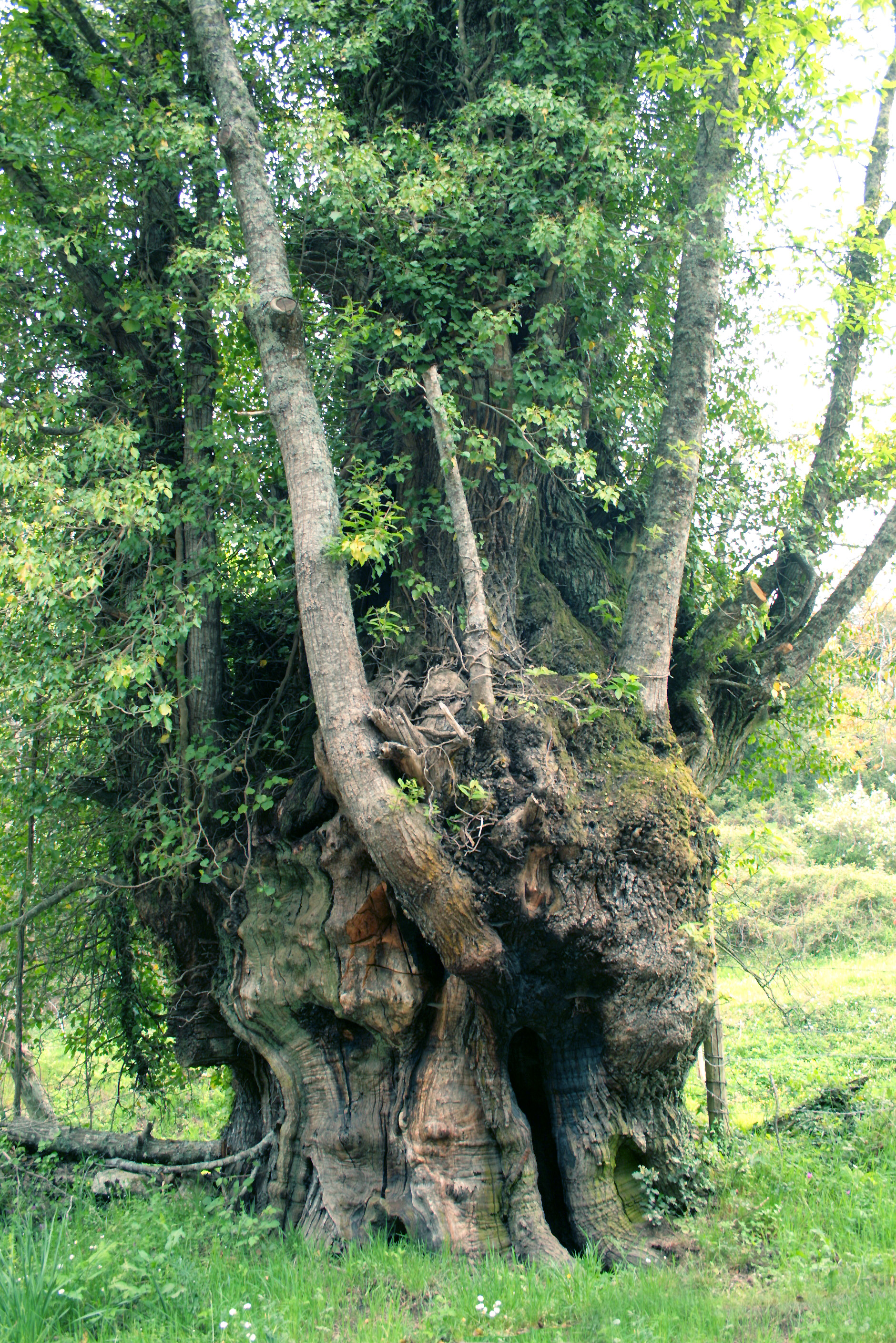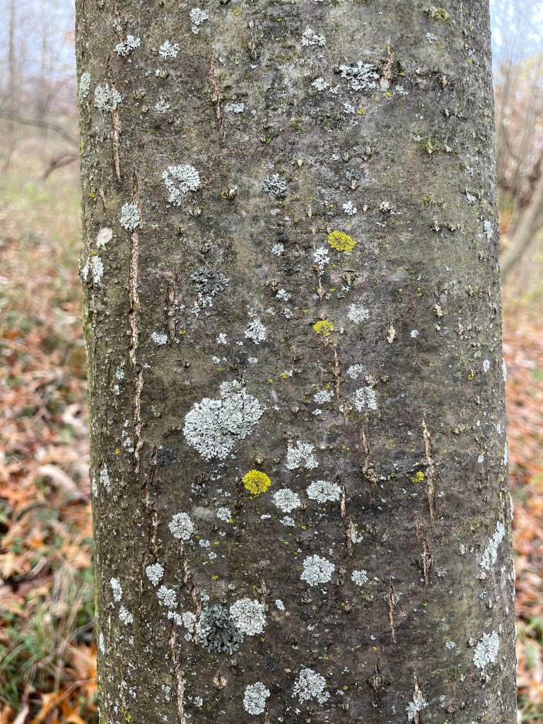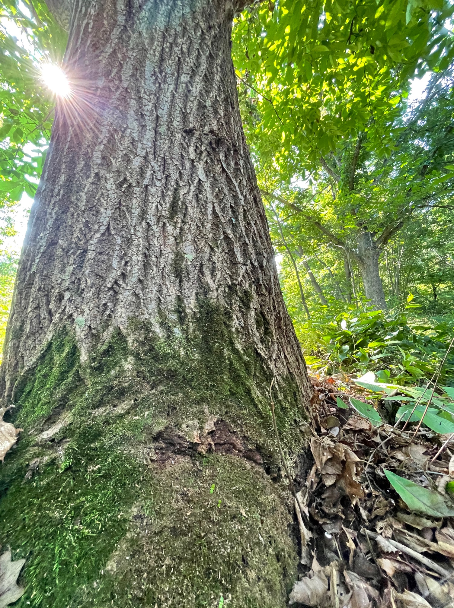 This is the European seedling grown from the nut mentioned in the beginning of my story. Although it rarely produces nuts, the nuts it does produce make very nice seedlings some of which are growing nearby. It has a lot of dead wood in it but the tree has continued its life at my farm finding a portion of the canopy adequate surrounded by hybrid Burenglish oaks and butternuts. The light is bright.