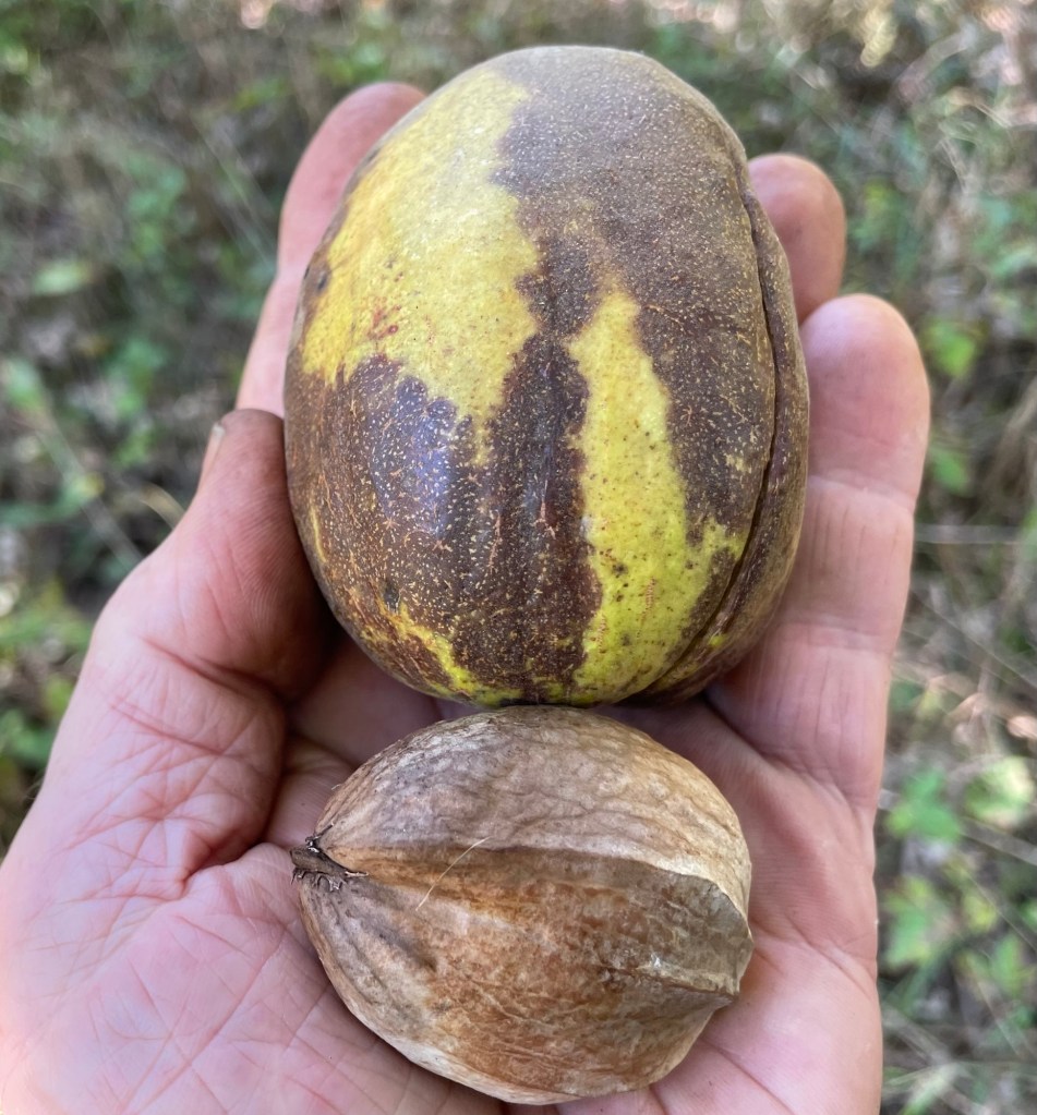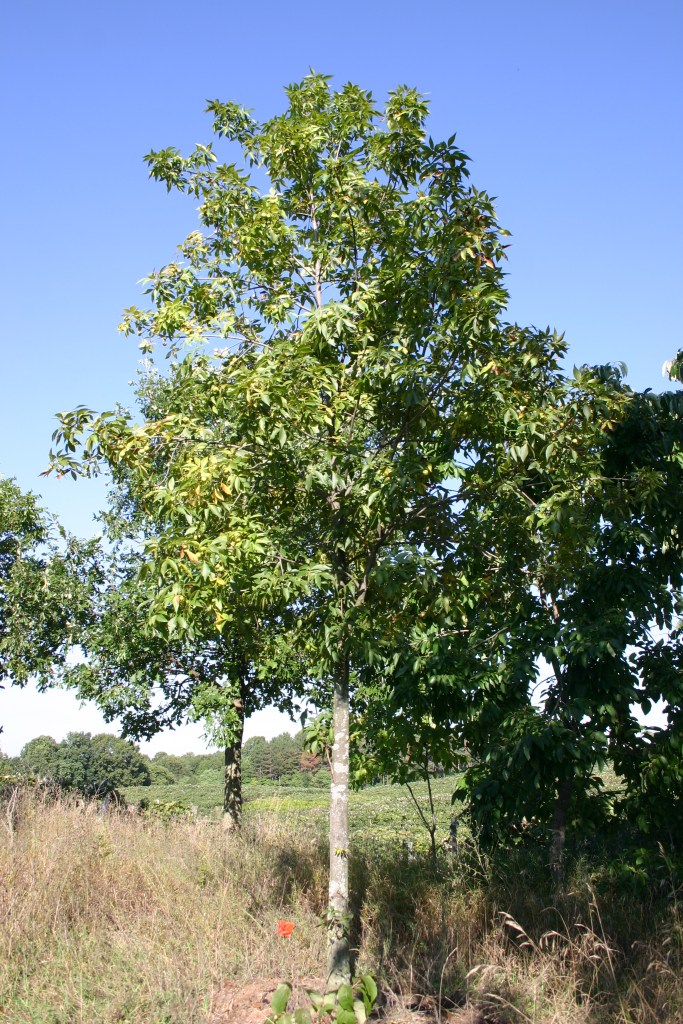 One such hickory hybrid is the lecont hican. It is a water hickory and pecan hybrid cross. Carya aquatica x illinoensis. It has an amazing speed of growth far greater than any other hickory I have grown. You could easily grow a four foot tall tree in one year in a small pot. For a hickory tree, that would be considered a miracle of science. Yet, a fast growing hickory tree was not jumping off my shelf in the retail nursery trade. I grew this plant off and on for twenty years. As much as I loved it, my ethusiasm did not equate with sales. It was a lone tree on the dusty plains filled with other nice ideas of retail sales. Few wanted it. The great thing about was its hardiness as well as its growth rate. To this day, I have not idea from the trees I have established what the nut production is like. It was completely hardy to at least minus 20F which was kind of shocking to me since I was getting the seed from Louisiana. I currently have mature trees of it at my farm. They maintain strong growth with a central leader and no narrow crotch angles like the pecan has. The population is very uniform when growing them from seed. Without a doubt faster growing selections could be made for a form of hickory lumber that could be developed making sizable trees in half the time of other species we currently harvest. Planting was done in my polyhouses using 10 inch deep bottomless containers with straight sides. The trees take a year off after transplanting but then grow quickly again. It is easily limbed upwards to create a straight and knot free lumber just like black walnut. This particular selection of hickory was harvested at one time and sold as Bitter pecan. Bitter pecan is lecont hickan and is a naturally occuring cross fround in the south where wild pecans and water hickories grow. No one really knows this selection much but I did find out that each year I purchased the seeds, they were different in size and shape. This is normal in hybrid populations. Some had smoother shells and others were rough like the water hickory. One thing they had in common was the tannic tasting nut.There was no way you could eat it. It was very similar to bitternut. It takes several minutes for the intense dryness of the Sahara desert in your mouth to disappear. It is very oily and could be used as an oil crop. This particular hickory highlights a situation that relates to other tree crops. Even if you develop something very positive and useful for the future of agroforestry and other forms of forestry, it may never see the light of day in terms of practical applications. It highlights the slow moving ideas in conservation and agriculture where everything takes too long to work out the details. It would only take a hundred acres of this cross and you would begin to see miracles of science take place. In some ways it is like creating a solution without a problem. The problem is not clearly defined or doesn’t exist. Without a problem, no action is taken. There is no money or energy to give it the lift it needs in terms of practical applications. Meanwhile back at the farm when I round the corner in my truck, I give them a mental high five and think of all things hickory.