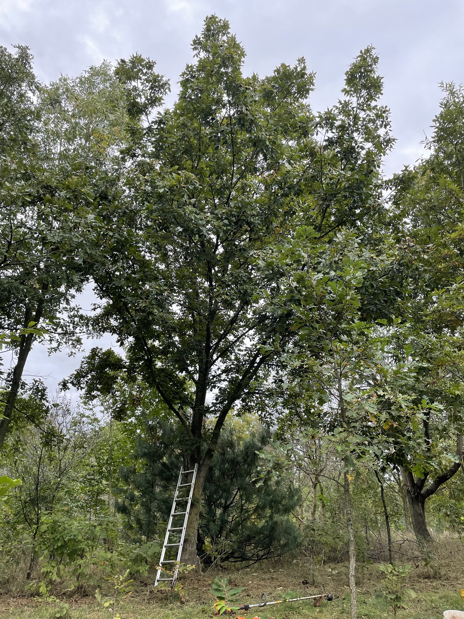 The overall purpose of my hickory obsession was to create a seed repository which would allow me to collect the nuts in a timely fashion and use them for nursery stock. It did work. But it was much cheaper to buy the nuts from other growers who also had a hickory nut obsession. There was few wild trees to collect from in southwestern Michigan. I did find three trees. It took exact timing to drop the nuts to prevent the squirrels from hauling them off. When a shellbark hickory nut falls from a tree, the speed of travel to the top of a human head can be significant. It is a large nut with a hard shell. With or without the outer husk, it is quite a knock on the noggin. One Dodge truck I was using by putting a ladder in the bed under the tree suffered serious dents in the hood as the nuts came raining down. I decided to go to a hard hat after that realizing my whole scenario of a ladder in a truck bed collection method was dubious to begin with. Should I fall in the process of my love of all things hickory, it would leave others wondering of my mental state. It certainly would make a good story. The police might treat it like a crime scene. Why the ladder in the pick up truck? Why the nuts? Who in their right mind would do this?