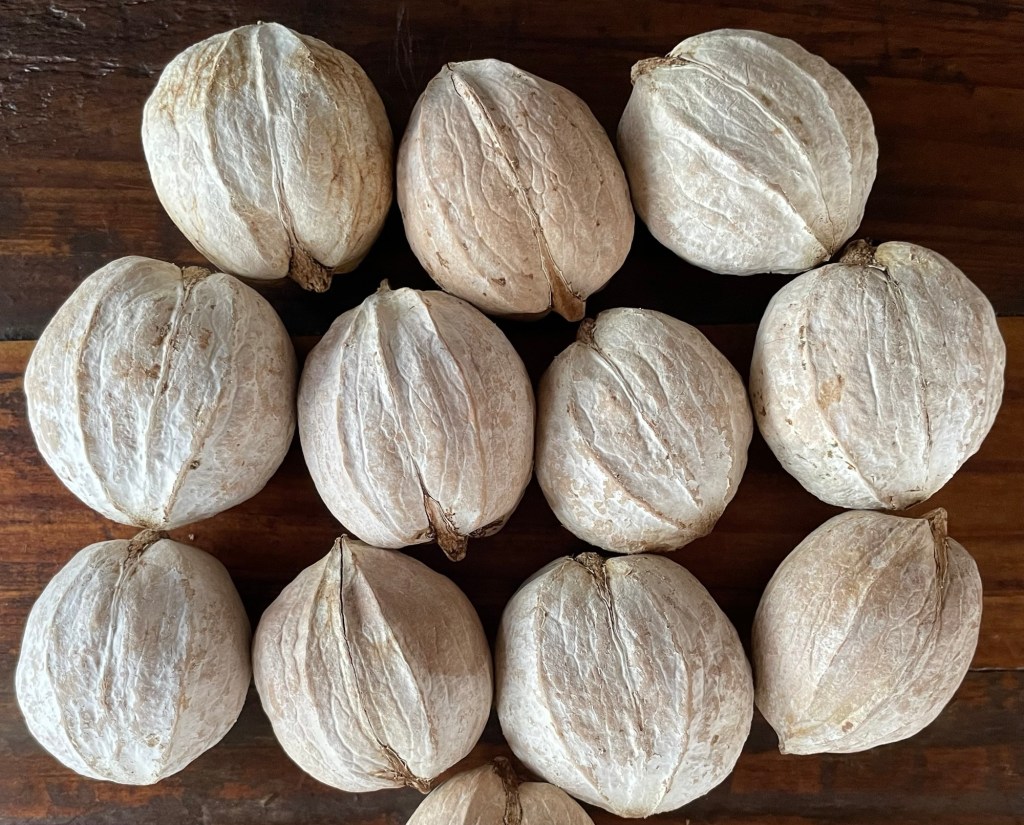 Eventually I went to shaking the nuts by climbing the tree or using pole pruners. When the nuts hit the ground it is like drums from a distant land all beating the praises of hickory. Collecting nuts off the ground allowed me time to understand and ponder the genus in terms of cultivating it and potentially finding varieties in my plantings. I did notice that it was extremely rare to find other species of hickories throughout the world. I did not have the luxury of travel to places where I could collect or reach out to other countries. It turns out North America is rich in hickory so I did not have to look far. I began to read more about the genus in the great manuals of Charles Sprague Sargent, Manual of the Trees of North America, pages 176 – 200. Here hickories were plentiful and rich in history with great diversity of subspecies. I began to explore growing them at my farm including the black, sand and nutmeg hickory, lecont hican and many other natural hybrids. Despite their southern origins, they grew very well in Michigan. I think many of these species had larger ranges at one time and show remarkable hardiness far greater than in their native ranges suggest.