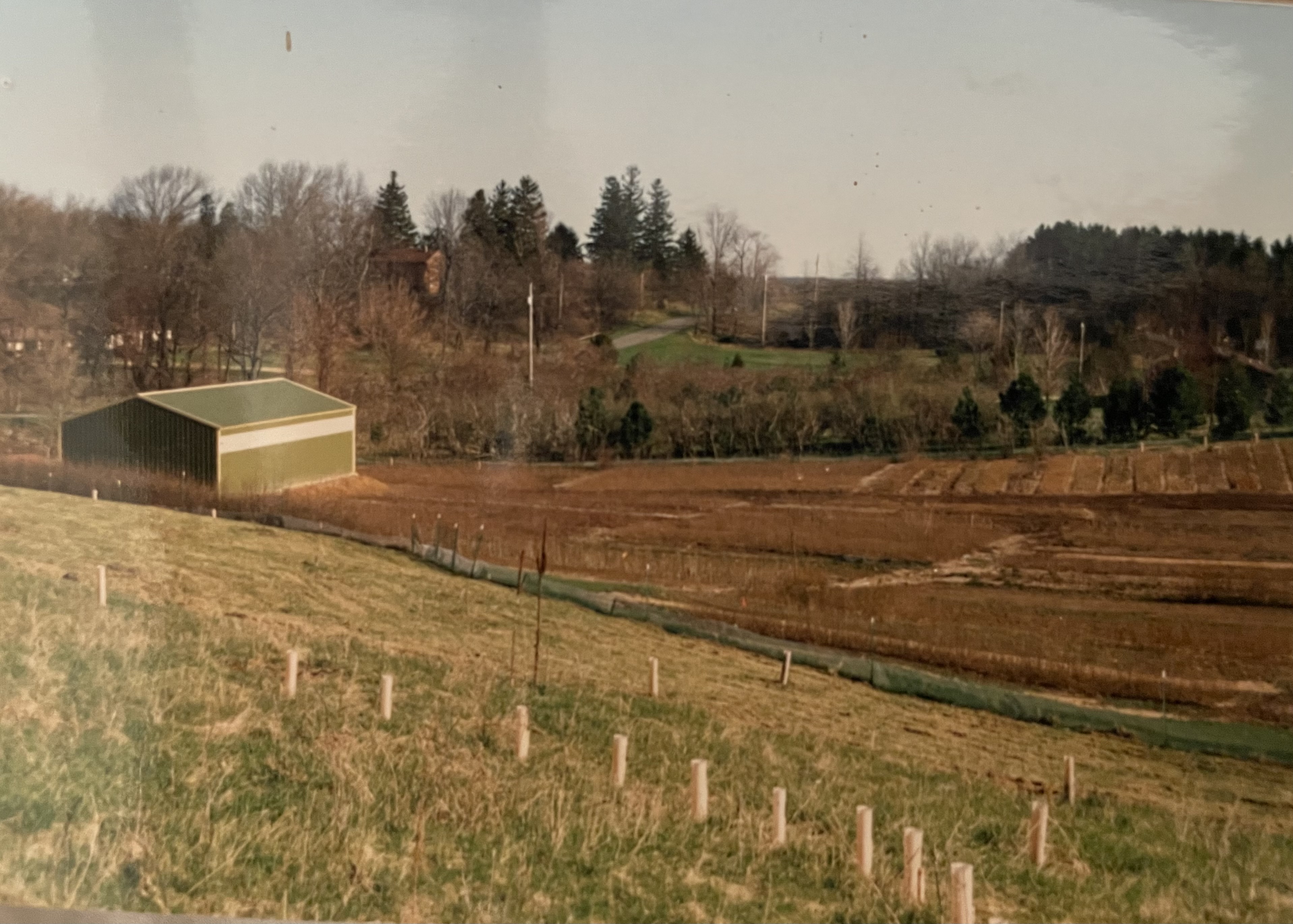 The first trees I planted outside of my nursery into the pasture were hickories. It was in the early 80’s that I acquired the property and began my nursery. The snap shot above tells the story. At that time, people shunned the hickory genus only because it was hard to establish due to the tap root. This led to a high failure rate when transplanting. Finally, with the advent of tubex tree shelter, the hickory tree was very easy to grow in my pasture. The pink tubes gave a sterile hospital vibe to the land. The tree tubes allowed for the slow regrowth of the tap root after cutting it off while digging the tree while at the same time protected the small emerging leaves in that first critical year. The warm, moisture and carbon dioxide rich environment in the tubes speeds the growth of the hickory and prevents dessication. I did not know this at the time, but the foliage of shellbark hickory has a wonderful nutmeg smell to it in the spring. It is this aroma that seemed to attract deer to the plants which would then munch on the leaves from the newly emerged sprouts. Eventually the trees grow past past the salad bar browse line. In the area shown above, the wind off the treeless hillsides was brutal making everything drought prone. The tubex shelter eliminated that problem. I was very fond of the Shellbark hickory, Cara laciniosa and most of my plantings have this species interwoven with its hybrids and other hickories. It was also one of the easier hickories to grow from a seedling. The tubes you see in the front row are Long Handled Almond or Prunus pendunculata. The others are all hickory.