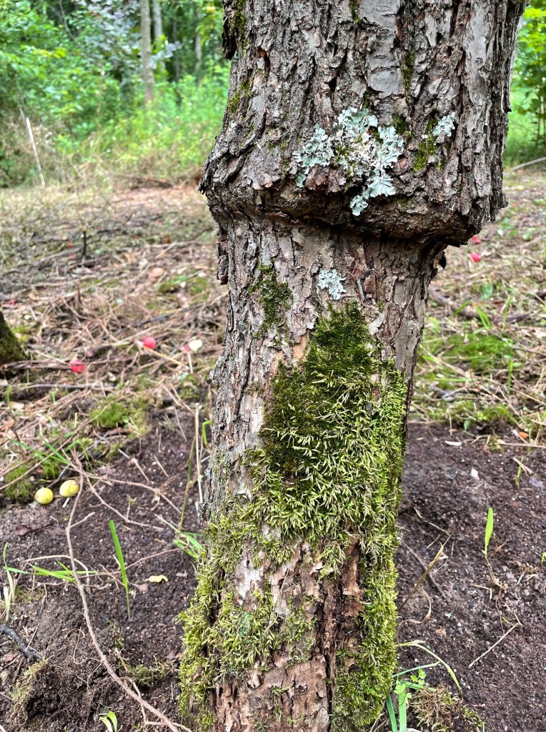 Not every plum species is available in commerce though. I don’t want to paint too rosey of a picture. There are gaps. Part of this due to the isolated nature of the plums in areas of the country that has no collectors. Few people are aware of the wild plums anymore too. One of these species was the Wild Goose plum. The species is a mixture of midwestern and southern strains spread out over several states where they exist only in fence rows, abandoned rail lines and other forgotten unmanaged places. I could not find a source of the seeds. One of the scientists who had a part in the plum group of the North American Fruit Explorers sent me scionwood of what he said was the original ‘wild goose’ plum. I did not know there was an original and soon I had the scionwood. I was hoping for the seeds, but he insisted I did not want that. He said the seeds were not reliable. Don’t use the seeds he said over and over. He was a fruit researcher and in that universe everything is cloned. The other plants are worthless seedlings. At my farm we grafted the scions onto the American plum roots as seen above. The trees did very well and I moved them to my outback planting in one of the most exposed hillsides to wind and sun. There the top soil was thin. The trees flourished yet there was no fruit production. Every now and then over the course of a decade I would check the trees and see nothing. One year in late July, I noticed crows in that area landing underneath the trees. It was very odd. They were very noisy. That caught my attention. I thought something had died there. I went over and soon found seven pits each carved out and cleaned of the fruit by the crows. Thank you crows for alerting me of the pits. I did not get a chance to taste the fruit yet, but it looked delicious. The crows said it was good so I am going with that. I grew the trees from these pits and planted them right next to the grafted trees. As they began filling out and flowering the grafted Wild Goose began fruiting in much greater quantity. I had created a fruitful population while increasing the fruit set of the grafted Wild Goose plum. Wild Goose was not the most productive plum tree but it was delicious and juicy. No wonder people cultivated this variety prior to the cultivated plums we eat today. Now I had a group of its siblings and each tree began fruiting in great abundance. This was the population I was searching for with each plant contributing to the population.
