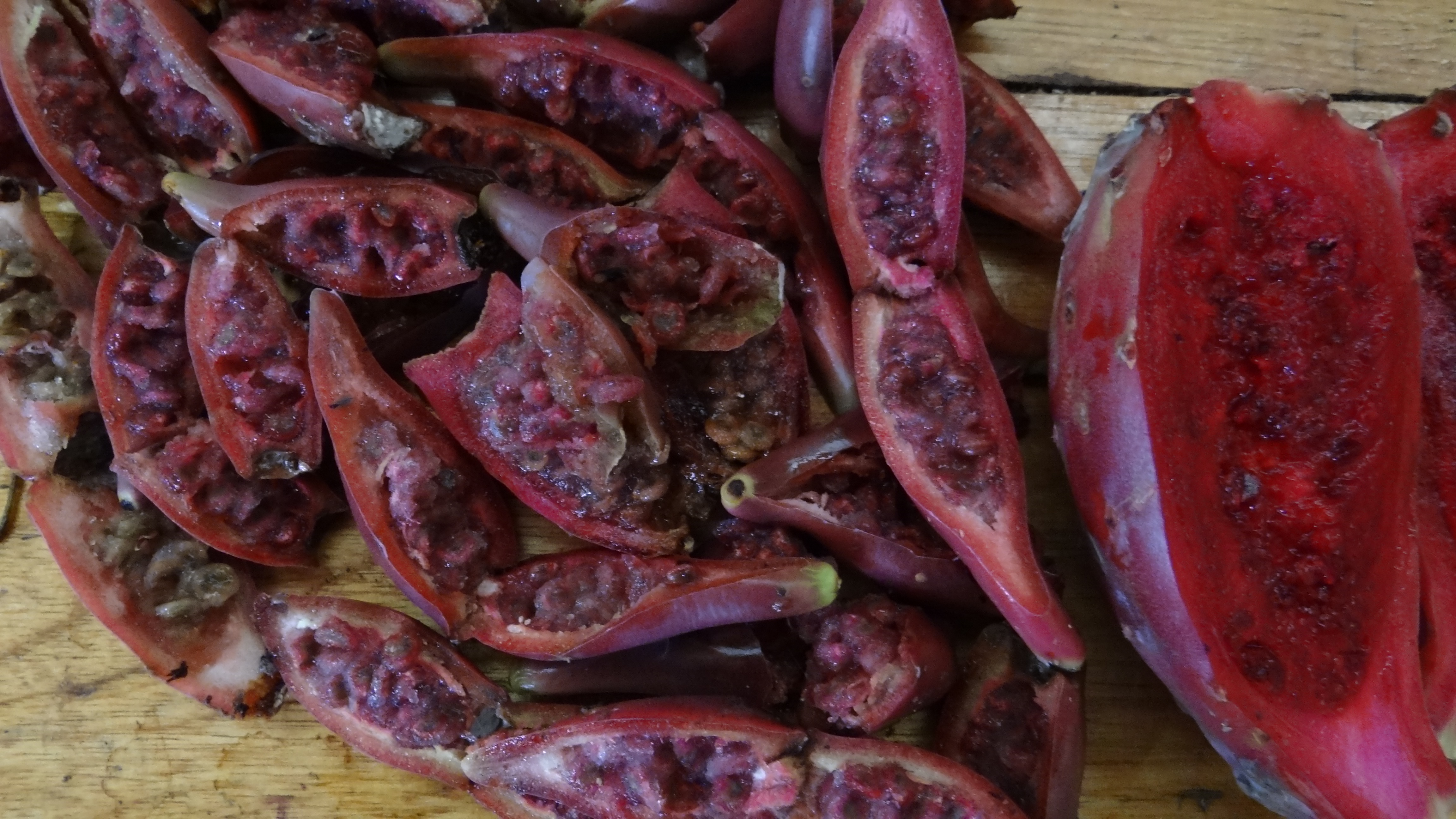 When I first started growing cacti at my farm, I did not have any living germplasm to draw on. I remember seeing a giant field of Prickly pear cactus on a biology field trip when I was a student at Western Michigan University. It was the largest patch of densely packed pads I had ever seen in Michigan then or now. It was easily a solid acre of cacti growing out of pure sand. Since starting my farm, I have been a big fan of seed production of everything. Cactus is easy to grow from cuttings, but I really was on the hunt for seeds. It turned out there are huge growers of cactus in the U.S., and some have the most wonderful seed lists I had ever seen of any genera. I started by purchasing seed from J.L. Hudson Seeds of different mixtures they offered. I grew them on a hill near a boulder I meticulously dug out of the soil in one of my planting beds. The plants began fruiting in three years. Some individuals within that seed mixture were not fully hardy into zone 5. I knew that when I purchased the seed, but it was enough to create my first from seed cactus. It was the edible fruit I was most interested in. I knew that cactus fruit called tuna could be used to make jelly and is said to have great health benefits like aloe vera.