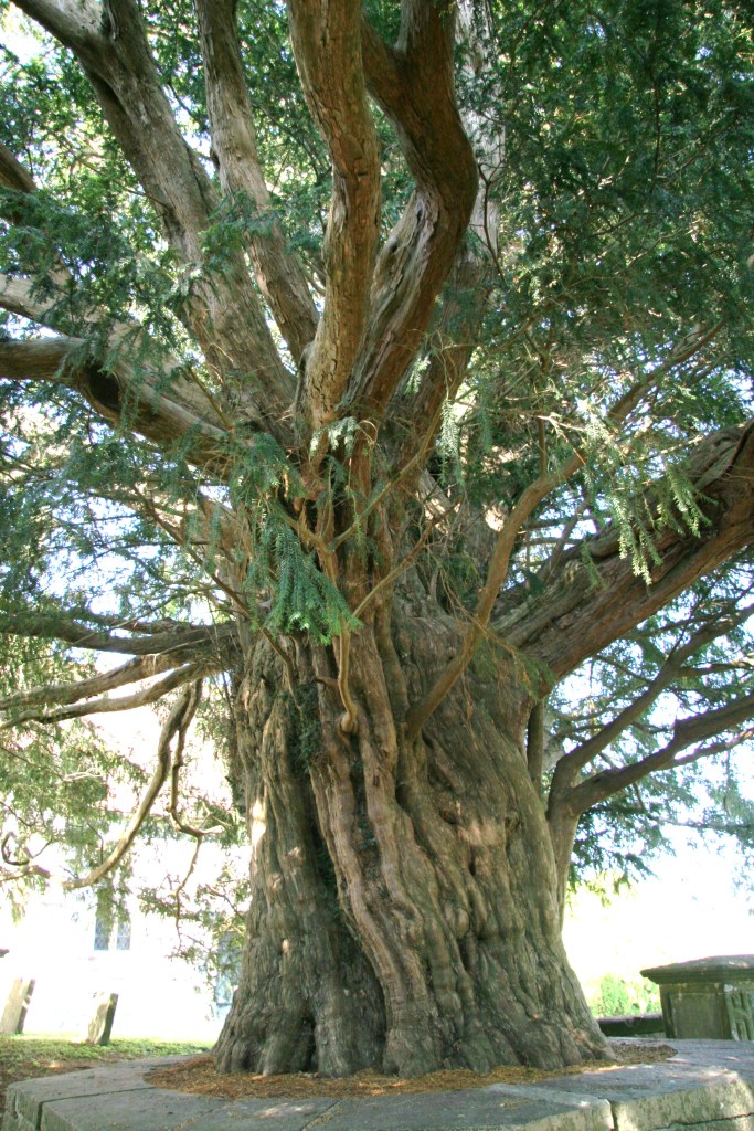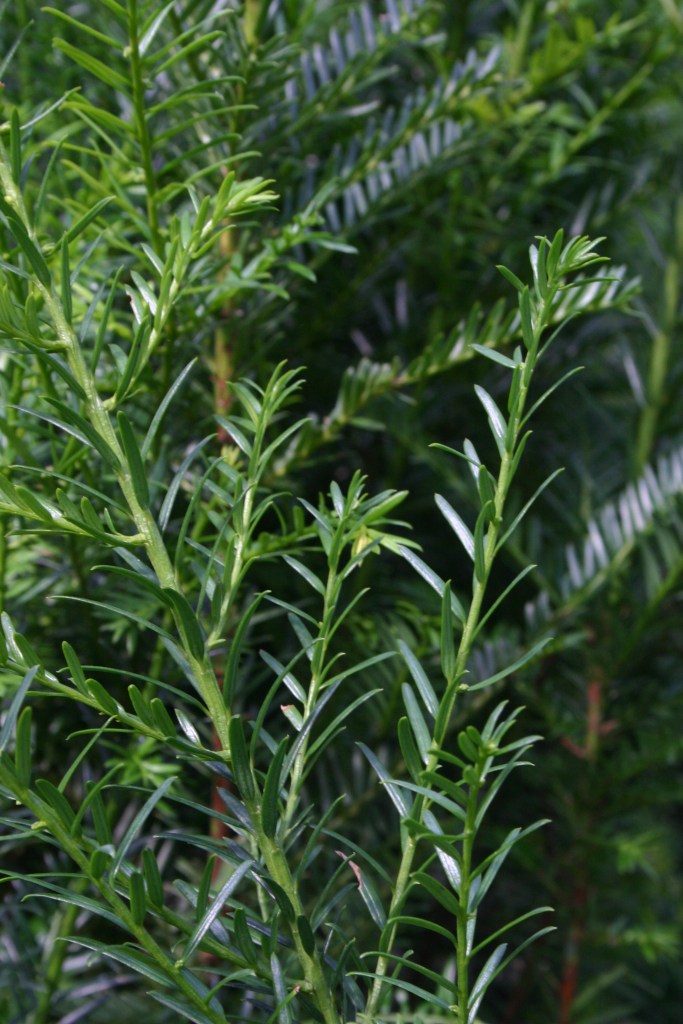 I have always been fond of yew. It was one of those species that inspired me to grow trees in my mind. Where in creation is yew? For me it was only in photographs. Like the one above, I saw them in the thousand-year-old trees in cemeteries and churches in the U.K. that made me wonder the history of such magnificent specimens. Most landscapes today have yews within them. They are the standard of the landscape industry as an evergreen shrub with rich dark green foliage. Their spiritual nature has been sidelined but not forgotten. Instead, yew liked us and decided to move in closer. They live a long time and tolerate the worst soil and air conditions while being disease free. When I began to grow the yew from seed, I started to notice large specimens that were not trimmed in untended landscapes. They became wedged in my consciousness as a sort of immortal species with the same ancient reverence that others enjoy in stone architecture. There was one yew shrub that grew a large multistemmed top to 50 ft. in diameter in front of a large home near a park where I still visit. I told the owner how special that plant was and not to ever remove it. Normally yews are rooted as varieties selected for specific ornamental appeal. I was more interested in the fruit and the wood quality than anything else. Late at night sometimes I would hear the deer bump into my house as they positioned themselves between the deck and planting bed eating my ornamental yews. In spring most of the foliage was gone. It is interesting that a cow or horse can eat a handful of yew foliage and drop dead. With its dozen or so alkaloids, it has protected itself against the human livestock. The deer benefits and thrives from the yew. I moved several seedlings out to my roadside. One made it past the browse line and is now ten feet tall straight as an arrow. This was yew I was searching for.