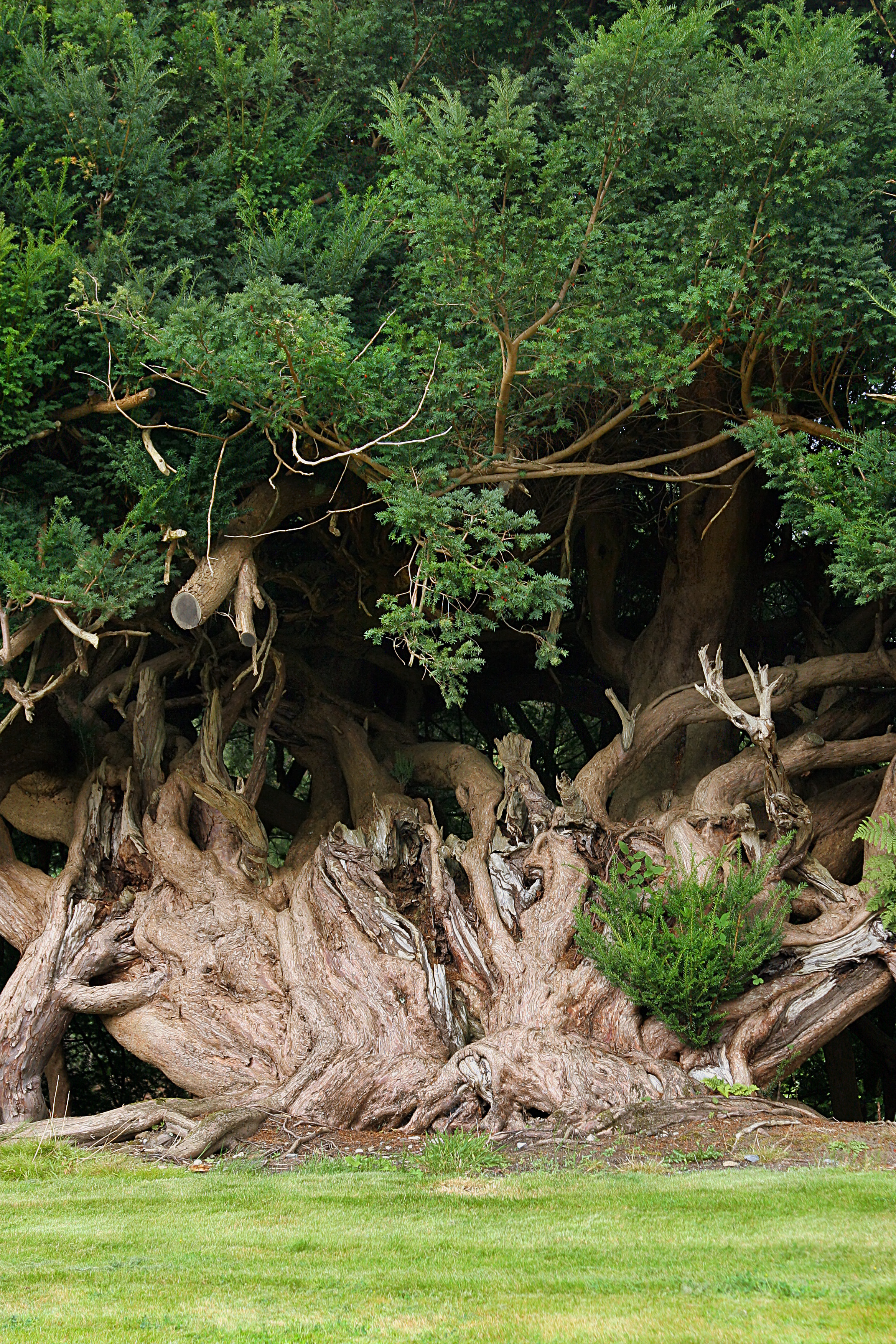 I have always been fond of yew. It was one of those species that inspired me to grow trees in my mind. Where in creation is yew? For me it was only in photographs. Like the one above, I saw them in the thousand-year-old trees in cemeteries and churches in the U.K. that made me wonder the history of such magnificent specimens. Most landscapes today have yews within them. They are the standard of the landscape industry as an evergreen shrub with rich dark green foliage. Their spiritual nature has been sidelined but not forgotten. Instead, yew liked us and decided to move in closer. They live a long time and tolerate the worst soil and air conditions while being disease free. When I began to grow the yew from seed, I started to notice large specimens that were not trimmed in untended landscapes. They became wedged in my consciousness as a sort of immortal species with the same ancient reverence that others enjoy in stone architecture. There was one yew shrub that grew a large multistemmed top to 50 ft. in diameter in front of a large home near a park where I still visit. I told the owner how special that plant was and not to ever remove it. Normally yews are rooted as varieties selected for specific ornamental appeal. I was more interested in the fruit and the wood quality than anything else. Late at night sometimes I would hear the deer bump into my house as they positioned themselves between the deck and planting bed eating my ornamental yews. In spring most of the foliage was gone. It is interesting that a cow or horse can eat a handful of yew foliage and drop dead. With its dozen or so alkaloids, it has protected itself against the human livestock. The deer benefits and thrives from the yew. I moved several seedlings out to my roadside. One made it past the browse line and is now ten feet tall straight as an arrow. This was yew I was searching for.