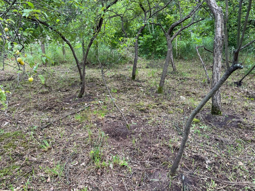 The prunings stay on the ground as fertilizer along with the whacked into green protoplasmic grass. Wild oregano of prairie origin is established here but it is not thick as other areas of my farm. That seeded in from 400 ft. away from a planting I did around 20 years ago. The existing Timothy and orchard grass are mixed in with some quack grass which is now fading over time to the point it is a minor concern as far as lowering the yields of the plum or apricot. Shade is a great equalizer in this arena. Patience is also needed for that to arrive to create that effect on the ever expanding plant community level. In this particular planting, there is one very large multiflora rose and amur honeysuckle that seeded in the shade of the plums brought in by birds who require the fruits to survive. When you prune the plants to the ground, the high protein sprouts become a favorite of white tailed deer and rabbits. Their manure is evident in this area which in turn feeds my plums with fertilizers. This in turn lowers the vigor of those plants and eventually they fade entirely. Both of these species also have viral infections which show up periodically and reduce and sometimes eliminate the plants entirely. Just another normal day at the tree crop farm.