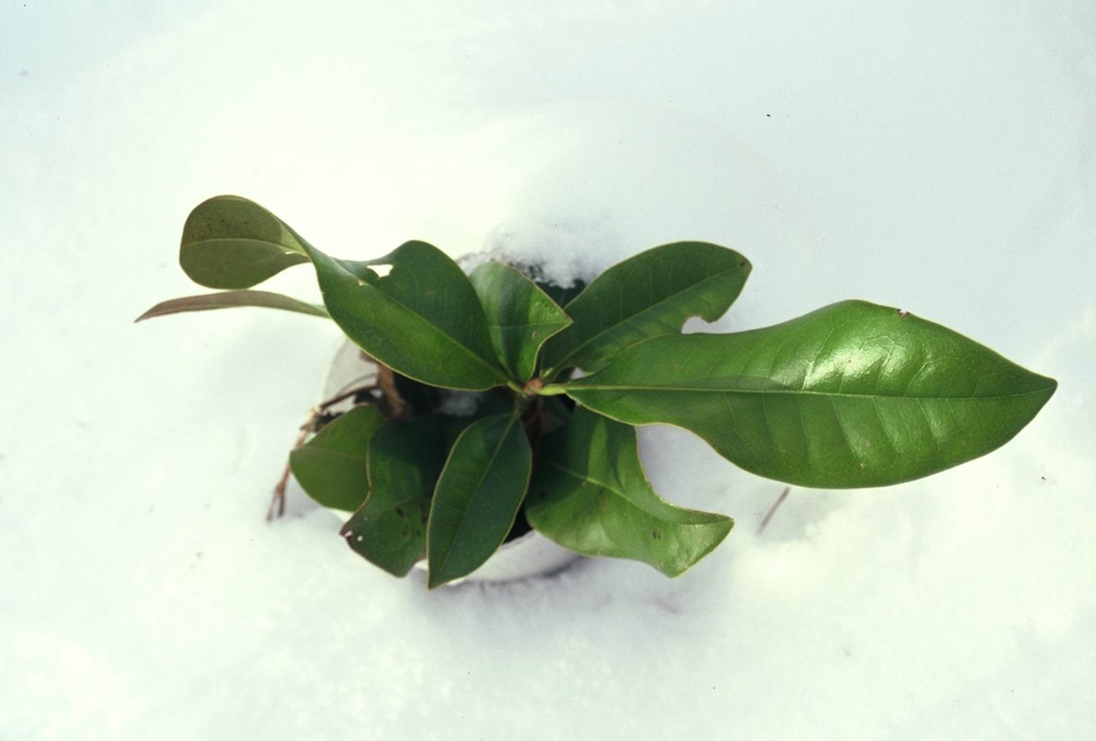The image above represents an individual plant in my little plantings of the coldest hardy Magnolia grandiflora I could find. I grew all of them from seed from the most extreme outliers of cold hardy individual plants that came to existence mostly through human intervention. I planted the seedlings outside as one- and two-year plants in these small plastic collars to protect against the elements. I mulched around each tree. I treated those trees like they were given to me directly from heaven. At some point I had over 40 plants outside growing in various stages. They were planted on a north facing slope somewhat protected by the oaks, pears and hickories I planted a decade earlier. The goal was to obtain a fully hardy evergreen tree to 80 feet tall. Why not? The species grows like this already. It was not like I was going to have to reinvent the wheel. Nature had already created it. The difference was I was growing seedlings and wanted to recreate that in the state of Michigan. As time went on, my little trees failed one after another until finally only one was left after a decade of trying. This one tree was impressive and grew to 3 ft. tall. But it too suffered huge damage in many winters. The seed sources go by names like “Minus 22F” and “Indiana-Wants-Me” and others. It turned out I was not alone. People were into finding this southern species because it is such a classic tree in North America. Everyone is on board. Even today you see these new cold hardy varieties meant to fight off the winter winds. The bottom line is this: no one I know grows them in cold areas like Michigan. It’s more like the Tennessee of winters. This is not the same. Go outside in your pajamas when it’s windy in January. There’s a difference. You might be able to get the mail but you’re not shoveling snow. The plants know this. People not so much so it’s a sort of genetic roulette.