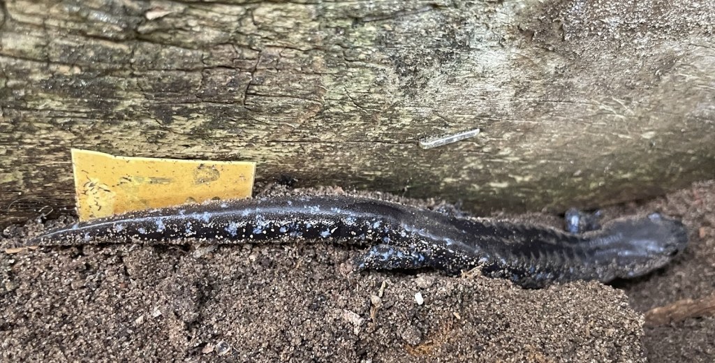 Blue Spotted Salamander. This expression and its larger diploid form is found here at my farm. They lived in my greenhouses for many years. Discovered while taking down my last greenhouse, I gently moved him under the walnut and pawpaws 10 feet away.