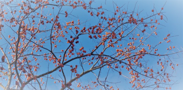 As of the third week in September, fruit is dropping now. When I shut down my power equipment yesterday, I can hear the quiet sounds of a fruit hitting my mulched soils. It is one fruit per thirty minutes. Soon that will ramp up until the rain of fruit becomes deafening and no one can ignore it. I will be there. The deer will come at night. The racoons and possums will dive into the pool and do backstrokes in the fruit on the ground. For a while, a neighbors lost pet pig experienced his ancestral roots here. Even the box turtle hibernated underneath them. Give-give-give is the philosophy of the persimmon. It’s American persimmon season and everyone benefits. Praise the Amur Roses. I’m heading towards the bright orange light of persimmon heaven.
