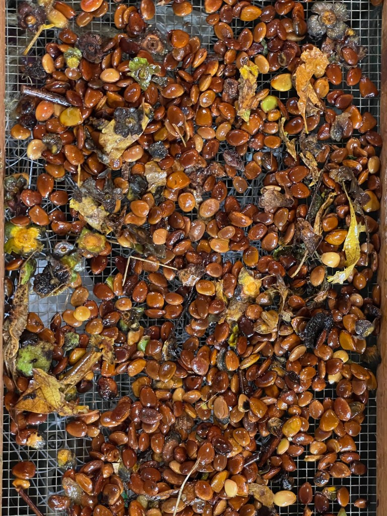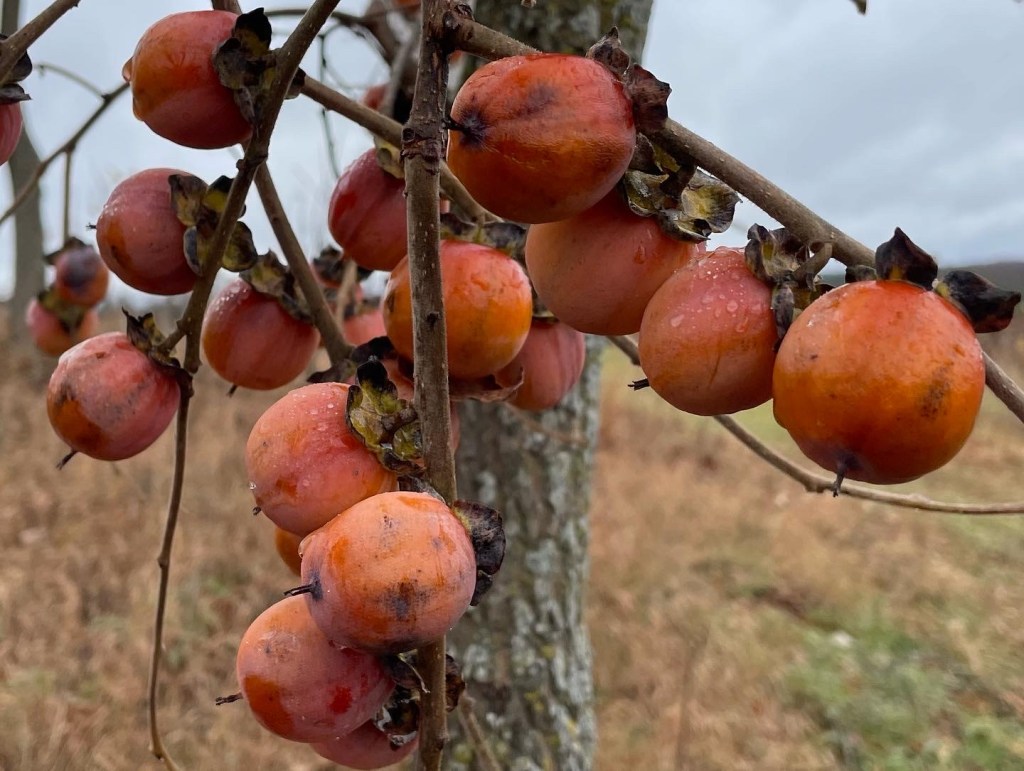 To achieve the best quality fruit requires heat units above 50 F for extended periods of time in the fall. Then the thirty percent sugar range and the smooth texture of a date is possible. It’s the only fruit that I know that has to drop free on it’s own to enjoy. You can shake the branches a little to bring down the fruit. But it is not a fruit to pick. It can’t be yanked. It must be plucked like a guitar string. You cannot pick it in the firm stage and ripen later. It is not a banana or a pear. The American persimmon needs to ripen slowly to imbibe the fall weather and bask in the Indian summer weather. A little frost is said to help but heat is what I need the most. Without that, it is an astringent tannin rich fruit fully capable of creating a metorite type of stone called a bezoar while blocking your intestinal tract in the process. Fully ripened on the tree is the only way to go. On a side note, bezoars from animals are saved and polished and used for pendants.
