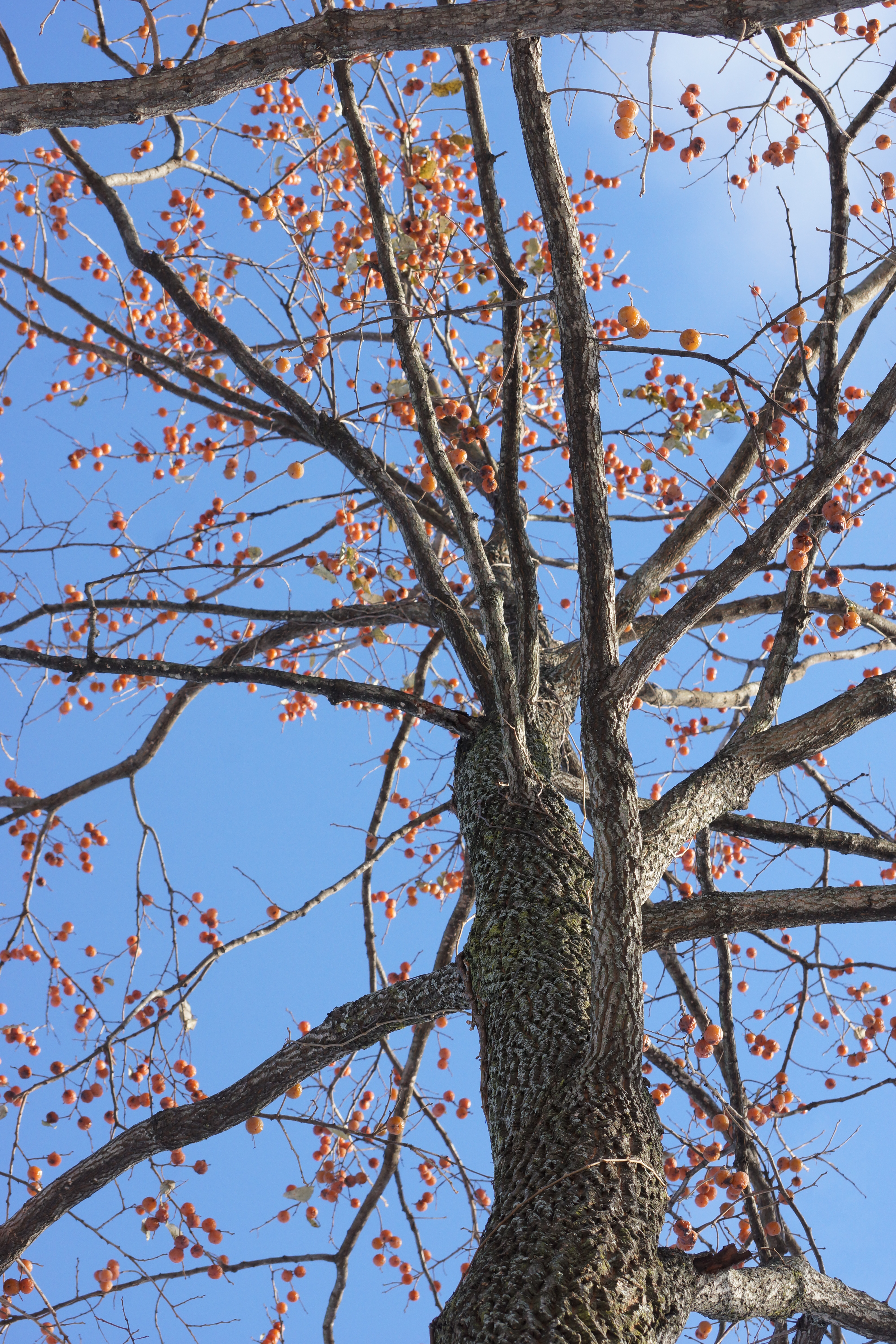 Selected American persimmon that ripens and dries in the tree turning into a date like consistency very quickly. Chewy and sweet the orange fruit turns darker as fall goes on. It has 4 seeds per fruit. All of the fruit drops fully by the first week in October which is prior to frost usually. This is a low moisture level fruit with a sweet and non astringent flavor which is easily stored. It is fibrous but easy to chew with a low moisture level. It may need additional drying for long term storage. It does not ferment on the ground. The yields are very high with fruit clustered all along the branches. The early ripening along with the date like consistency is an excellent storage persimmon.